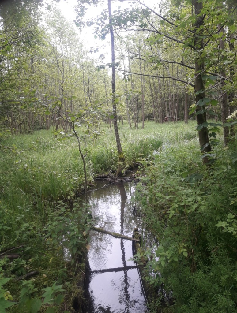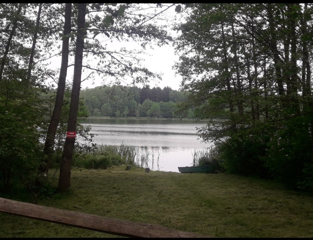 Tam szlak skręca w lewo i my razem z nim. Idziemy dalej przez las w kierunku północno – zachodnim i dochodzimy przez osadę Falk do parkingu leśnego i wiaty przystankowej. W tym miejscu znajdują się drogowskazy do Dębu Rzeczypospolitej. Niestety ostatnio jakiś D-E-B-i-L i N-I-E-D-O-R-O-Z-W-Ó-J, bo ciężko to inaczej nazwać, dał popis swojej fantazji i podpalił ten wspaniały pomnik przyrody 😦 Niedaleko znajduję się również Rezerwat Przyrody Jar Brynicy, który również warto odwiedzić. Jednak my idziemy dalej szlakiem niebieskim przez Traczyska, przechodzimy przez most nad wspomnianą już Brynicą, wychodzimy z lasu i dochodzimy do dawnego przystanku kolejowego na linii 208 Gutowo Pomorskie. Idziemy chwilkę wzdłuż toru, jednak na razie go nie przecinamy, dochodzimy do drogi wojewódzkiej nr 544, po czym po jakichś 500 metrach szlak skręca w prawo do wsi Gutowo i dopiero tam przechodzimy przez tor. Idziemy asfaltem, potem skręcamy w lewo w polną drogę. Dalej szlak prowadzi przez wsie Zembrze, Janówko i Mały Głęboczek, jednak w tym miejscu muszę przyznać, że zgubiłem szlak na kilka kilometrów i poszedłem drogą przez wsie Samin i Trepki, mijając po drodze malownicze pagórki i jezioro Trepkowskie. Następnie szedłem niedaleko wsi Długi Most, gdzie znajduje się również leśniczówka.
