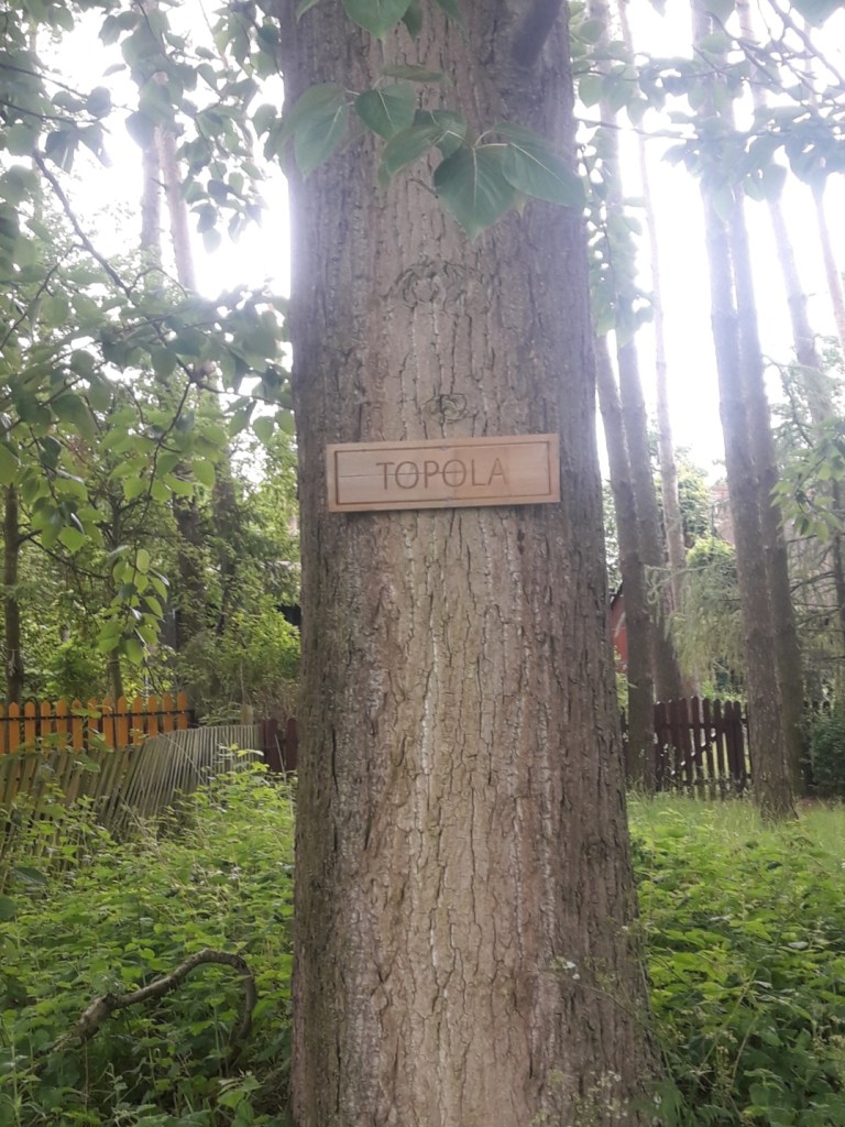 Szlak „odnalazłem” dopiero nad malowniczym jeziorem Sopień, na którego brzegu znajduje się kilka ośrodków agroturystycznych z małą plażyczką. Co prawda jezioro to geograficznie nie leży na Pojezierzu Brodnickim, tylko na Garbie Lubawskim, ale administracyjnie znajduje się w powiecie brodnickim w gminie Brzozie. Idąc dalej szlakiem wzdłuż brzegu natrafiamy na swoistego rodzaju ścieżkę edukacyjną z nazwami drzew. Kolejna część trasy prowadzi po podmokłych terenach położonych niedaleko doliny Drwęcy. Tam również można zgubić szlak, gdyż znaki nie występują regularnie i trzeba mieć się na baczności (przynajmniej w tę stronę, nie wiem jak z powrotem). Dodatkowo jeden odcinek prowadzi przez zarośnięte chaszcze i zaczyna się zwaloną kłodą w poprzek drogi, także nawet rowerzyści mogą mieć problem z przedostaniem się 😛 W końcu szlak dochodzi do drogi krajowej nr 15 w miejscowości Topiele i skręca w lewo do mostu na Drwęcy. Znajduje się tam miejsce wodowania kajaków. Tę część szlaku omówimy w osobnym poście. Ja jednak zakończyłem wycieczkę idąc w prawo do przystanku PKS Wielki Głęboczek.