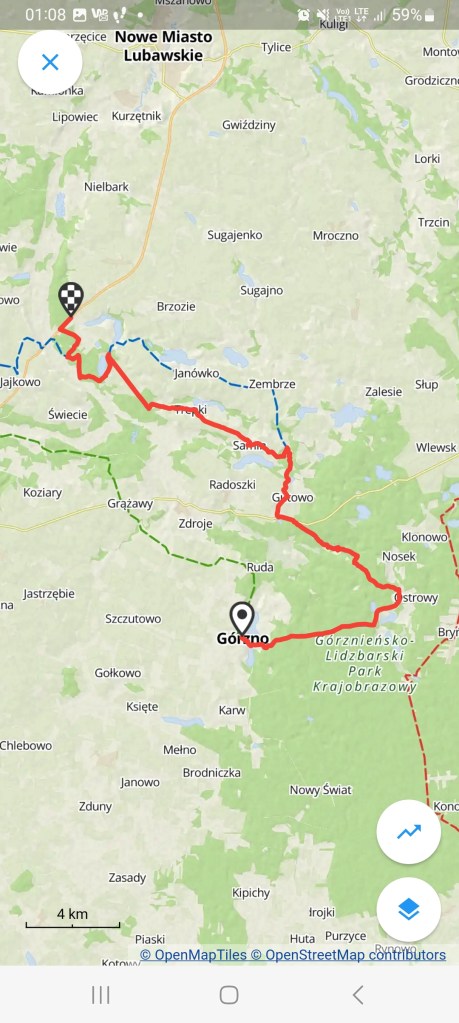 W powiecie brodnickim znajdują się 2 szlaki niebieskie. Pierwszy to już wspomniany w innym poście szlak Brodnica – Ostrowite koło Jabłonowa (https://maronwedruje.com/2023/07/16/szlak-niebieski-ostrowite-kolo-jablonowa-brodnica/), natomiast drugi prowadzi z Górzna do ośrodka PTTK w Bachotku i nosi imię Romana Sołtysińskiego (nie wiem czemu niektóre szlaki mają imię, a niektóre nie, może ktoś, coś?) 😀 W linii prostej odległość między tymi dwiema miejscowościami jest niewielka, jednak szlak wije się na odległość prawie 50 km. Warto w tym miejscu wspomnieć, że Górzno jest jednym z najmniejszych miast w Polsce i ma około 1 500 mieszkańców. Dojazd jest bardzo prosty. Możemy wsiąść koło stacji benzynowej Circle K (dawniej Statoil) lub na ulicy 3 Maja. Mamy również kilka przystanków na ulicy Lidzbarskiej, między innymi koło I Liceum Ogólnokształcącego oraz dalej przy skrzyżowaniu z ulicą Boczną. W Górznie ma również swój początek szlak zielony, o którym była już kiedyś mowa. Jednak on prowadzi z rynku w kierunku Brodnicy, a niebieski w drugą stronę koło kościoła Podwyższenia Świętego Krzyża, następnie schodzimy po dwustu kilku schodach z górki (w końcu Górzno) i dochodzimy do przesmyku między jeziorami Górznieńskim i Młyńskim, które łączy rzeka Górzanka. Idziemy dalej szosą i dochodzimy do plaży miejskiej. Później szosa skręca w prawo i prowadzi lekko pod górkę koło Dworku Wapionka oraz Bursy Uczniowskiej Jagódka. W tym miejscu w prawo skręca droga do Leśnictwa Górzno oraz Leśnictwa Nowy Świat, my natomiast idziemy dalej według wskazań szlaku prosto w kierunku wschodnim. Idziemy przez las około 10 km, po drodze mijając oryginalne zarówno drewniane jak i kamienne drogowskazy i dochodzimy do wsi Czarny Bryńsk, gdzie kiedyś znajdowała się siedziba Górznieńsko-Lidzbarskiego Parku Krajobrazowego. Do dziś funkcjonują tam ośrodki agroturystyczne jak i Zielona Szkoła Ekoczar.