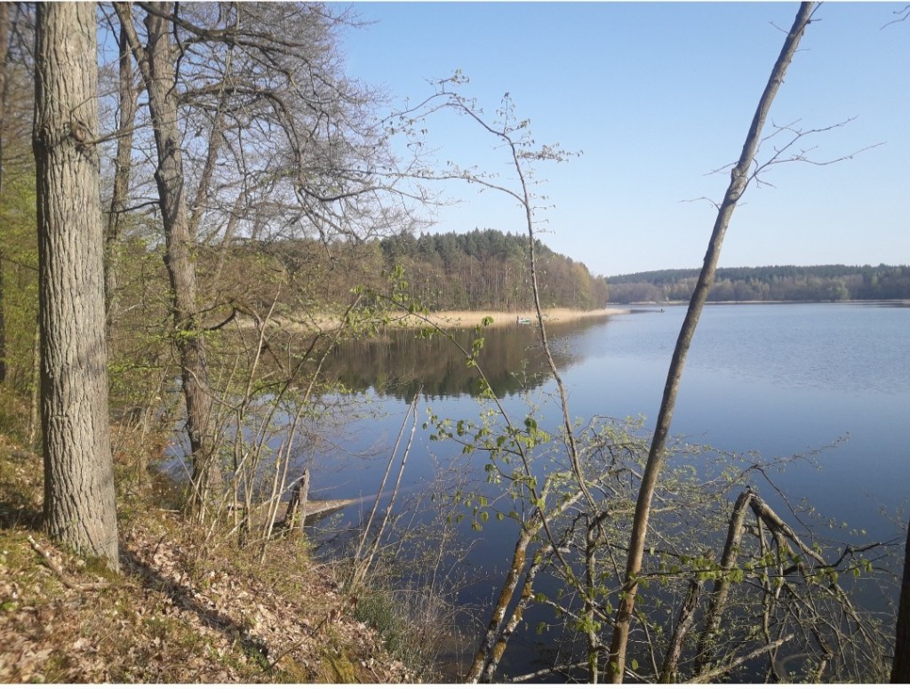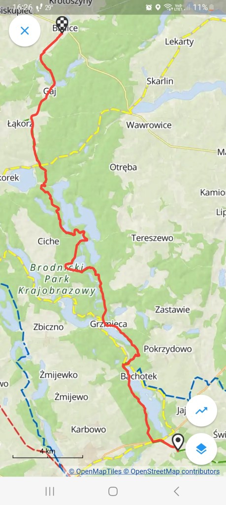 Niedaleko znajdują się 2 knajpy z dobrym jedzeniem, więc można tam się posilić przed dalszą podróżą. Kolejna część szlaku do złudzenia przypomina wymieniony już szlak niebieski, gdyż również przebiega wzdłuż kilku jezior, tylko prowadzi głównie rynną Skarlanki. Po minięciu stacji Tama Brodzka przechodzimy przez drogę krajową nr 15 i wchodzimy do lasu wzdłuż jeziora Bachotek. Jest to jedno z największych jezior na Pojezierzu Brodnickim, na drugim brzegu znajdują się liczne ośrodki wypoczynkowe, natomiast my idziemy brzegiem raczej bardziej spokojnym i cichym, jedynie gnie nie gdzie możemy natknąć się na wędkarzy albo kajakarzy.