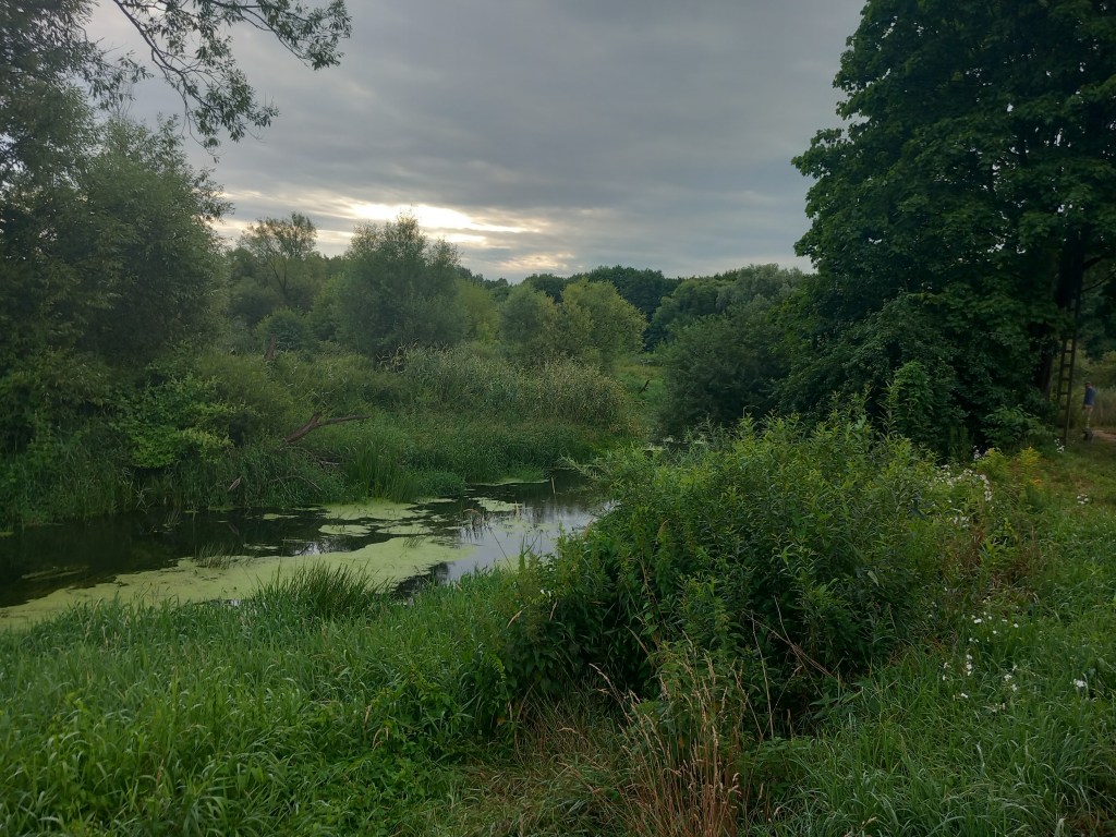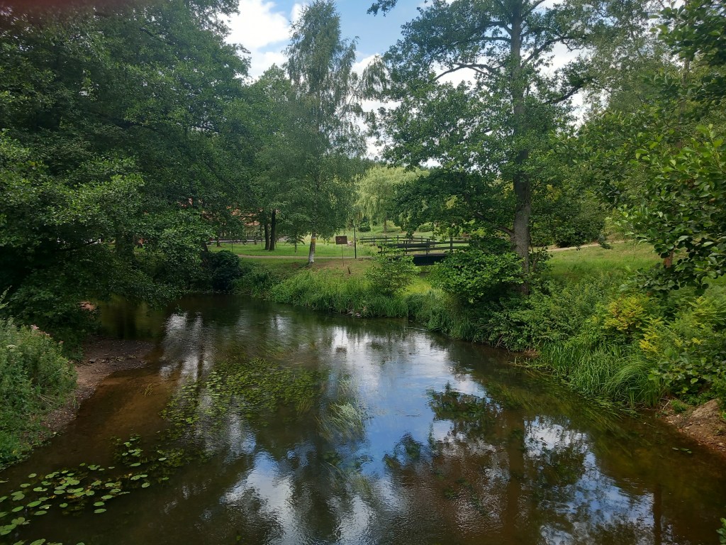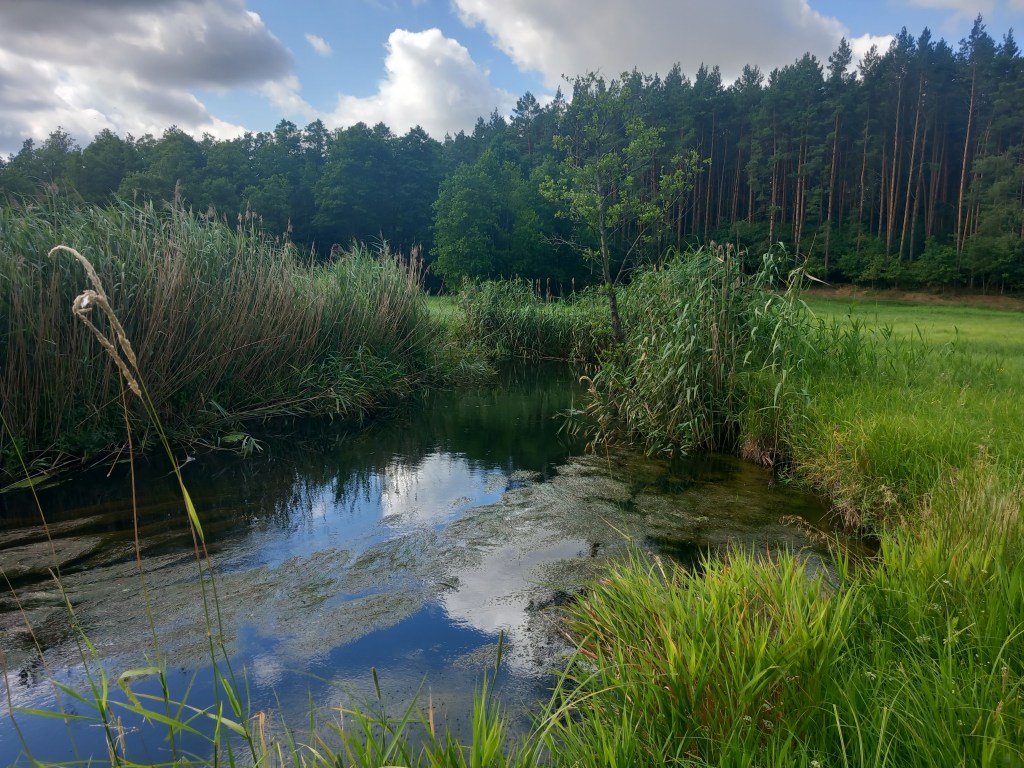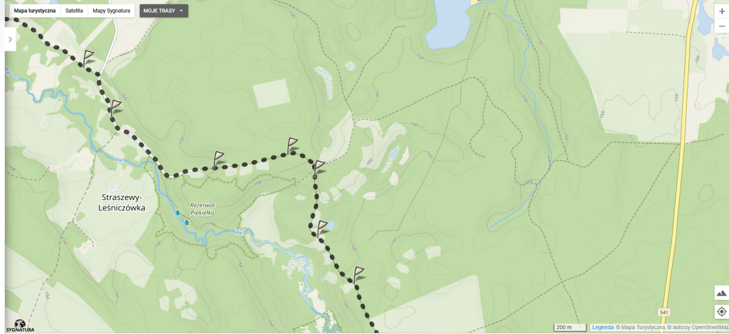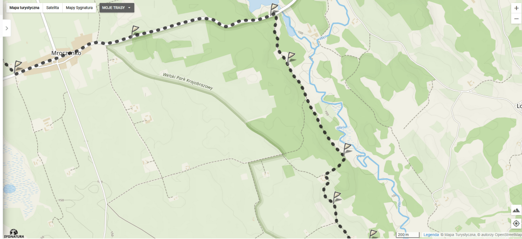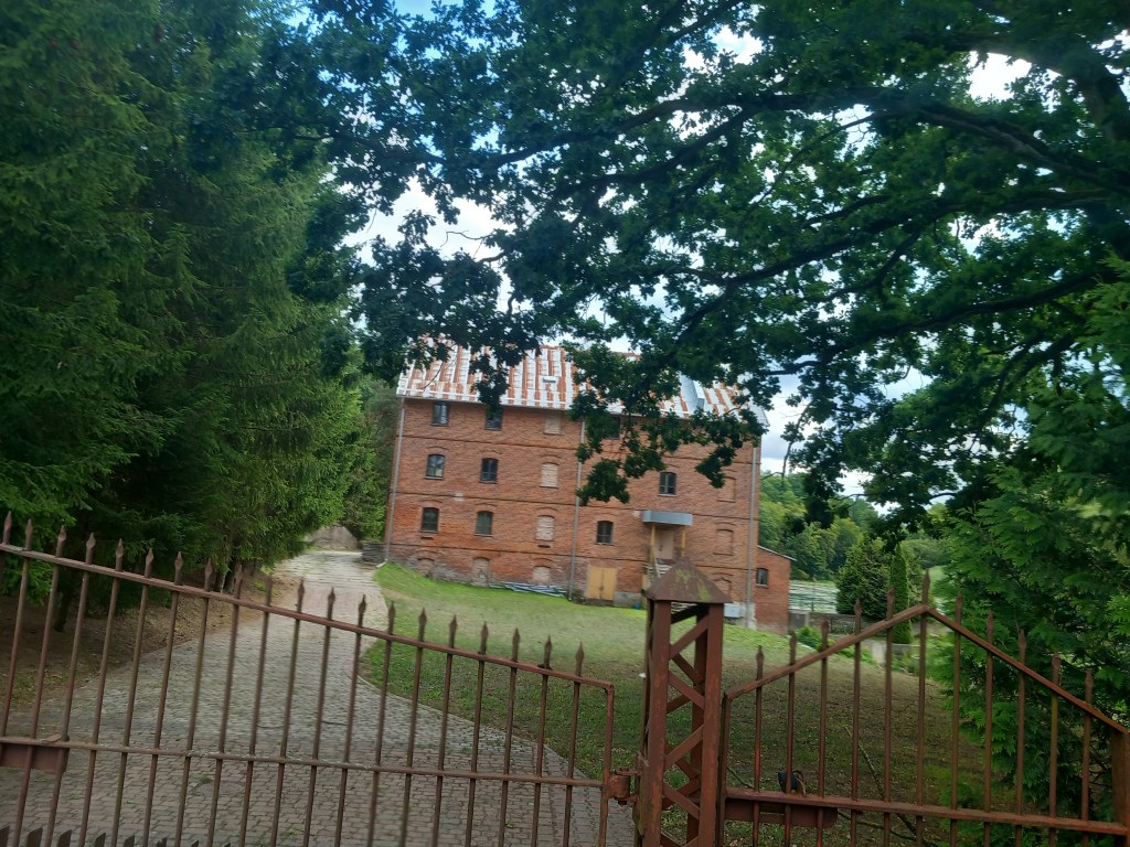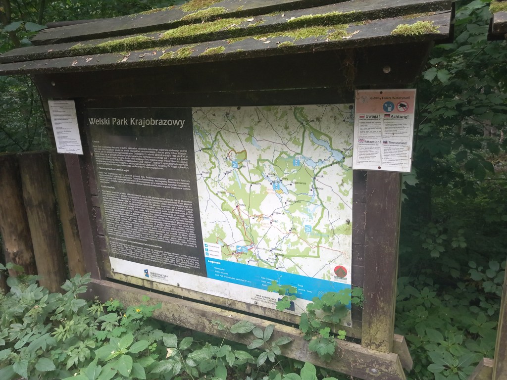 Tam po prawej stronie mamy domki turystyczne, dalej dochodzimy do kolejnego mostu na rzece Wel, gdzie po lewej stronie mijamy młyn wodny. Przechodzimy tym mostem, za nim szlak skręca w lewo w zarośniętą krzakami ścieżkę. Po jakichś dwóch kilometrach z lewej strony dochodzi ścieżka i jakiś czas idziemy wzdłuż słupów linii wysokiego napięcia przez las.