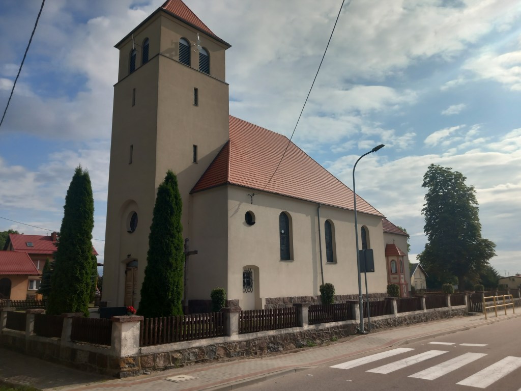 Dalej droga prowadzi pod górkę aż do wsi Gwiździny. Dla lubiących głośne rytmy umcia – umcia znajduje się tam słynna imprezownia/mordownia Ibiza. My jednak przed tym fascynującym miejscem na mapie imprezowej Polski skręcamy w lewo za boiskiem sportowym klubu piłkarskiego KS Wicher Gwiździny i dochodzimy do Skweru Ofiar Katyńskich, na którym skręcamy w prawo w ulicę Wiejską. Po lewej stronie mamy biały kościół pw. Św. Jana Bosko.