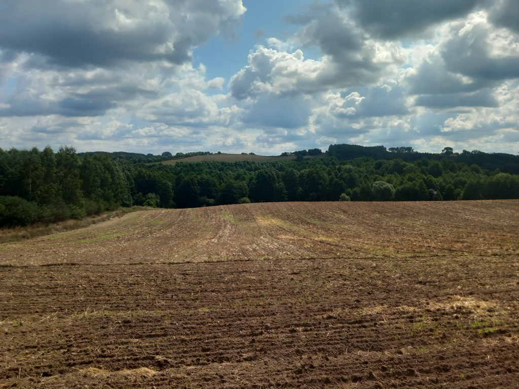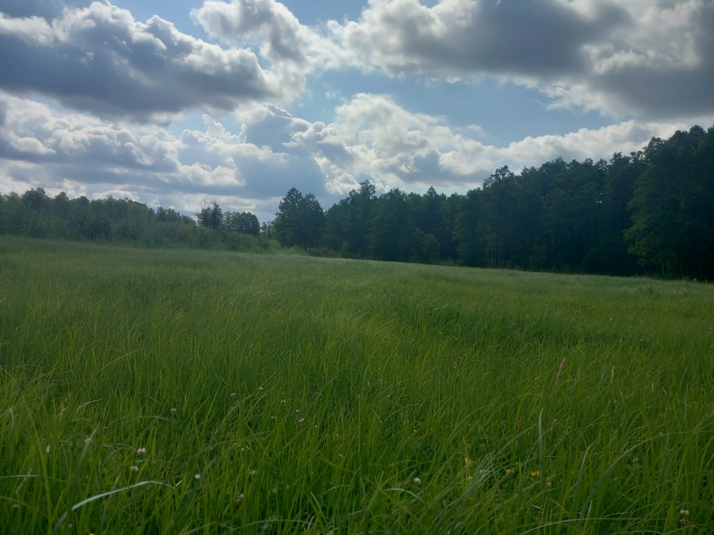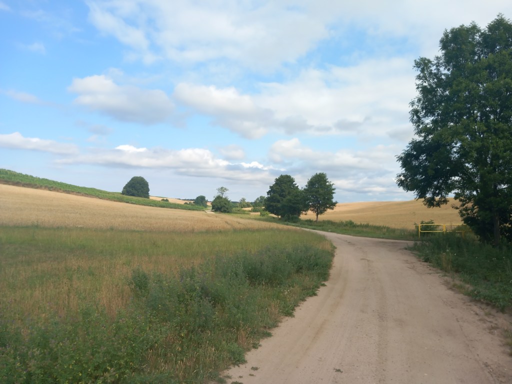 Towarzyszą nam malownicze pagórki. W końcu dochodzimy do asfaltowej drogi i skręcamy w nią w lewo przez most. Tam mijamy znak wsi Trzcin. Zaraz za mostem skręcamy w prawo. Droga wygląda tak jakby szła do prywatnego gospodarstwa, ale proszę się tym nie zrażać, przechodzimy przez bramę i wchodzimy na polną ścieżkę, która ponownie prowadzi pod górkę do lasu.
