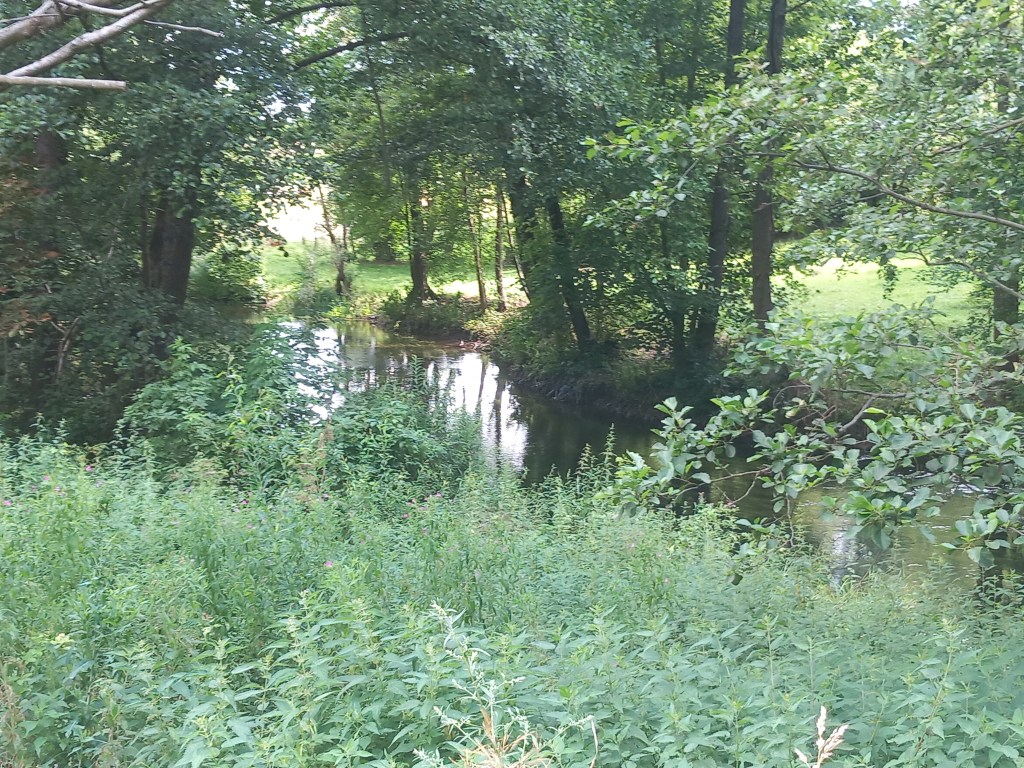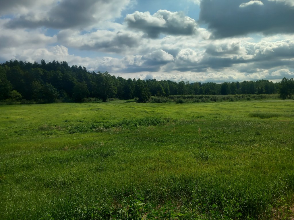 My jednak przed przeprawą skręcamy w prawo w polną dróżkę. Teraz mamy piękny fragment trasy, po lewej stronie idziemy wzdłuż rzeki, a przed nią rozciągają się trawiaste pola.