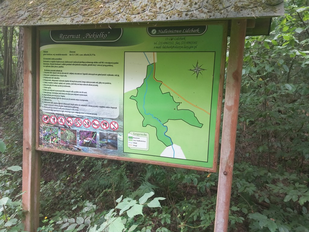 W tym miejscu mamy również po prawej stronie widok na rzekę wraz ze spiętrzeniem, za nim mamy coś w rodzaju małego zbiornika retencyjnego. Jednak my idziemy wspomnianą wyżej ścieżką w stronę lasu. Cały czas po prawej stronie mamy widok na dolinę rzeki Wel. Po jakimś czasie dochodzi do nas szersza droga i po prawej stronie widzimy tablicę informacyjną, która informuje nas o rezerwacie przyrody Piekiełko. Chroni on odcinek przełomowy rzeki Wel, która w tym miejscu przypomina górski potok.