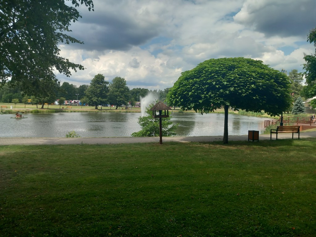 Po kolejnych kilku kilometrach las się kończy i po lewej stronie mijamy zabudowania mleczarni. To oznacza, że wchodzimy na teren Lidzbarka Welskiego (nie mylić z Lidzbarkiem Warmińskim). Po minięciu mleczarni podchodzimy pod górkę i przecinamy drogę wojewódzką 544 w kierunku Brodnicy. Za skrzyżowaniem ponownie schodzimy w dół i po raz kolejny przechodzimy przez most nad rzeką Wel. Idziemy przez centrum miasta, jednak nie osiągamy centralnego placu, mijamy jedynie ulicę Słomiany Rynek, po czym skręcamy wraz ze szlakiem w prawo w ulicę Sądową. Oczywiście można skręcić ze szlaku iść na przystanek PKS żeby zakończyć wycieczkę. Ja jednak miałem jeszcze 3 godziny do autobusu, więc postanowiłem iść dalej, żeby nie czekać 😀 Więc wspomnianą ulicą Sądową idziemy chwilę prosto, po lewej stronie mijamy budynek sądu i wreszcie po prawej mamy zejście po schodach w kierunku zbiornika wodnego. Jest to jezioro Lidzbarskie.