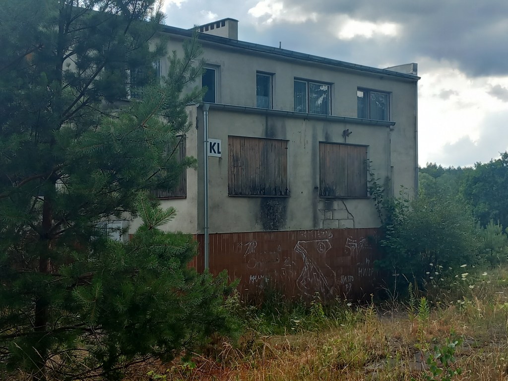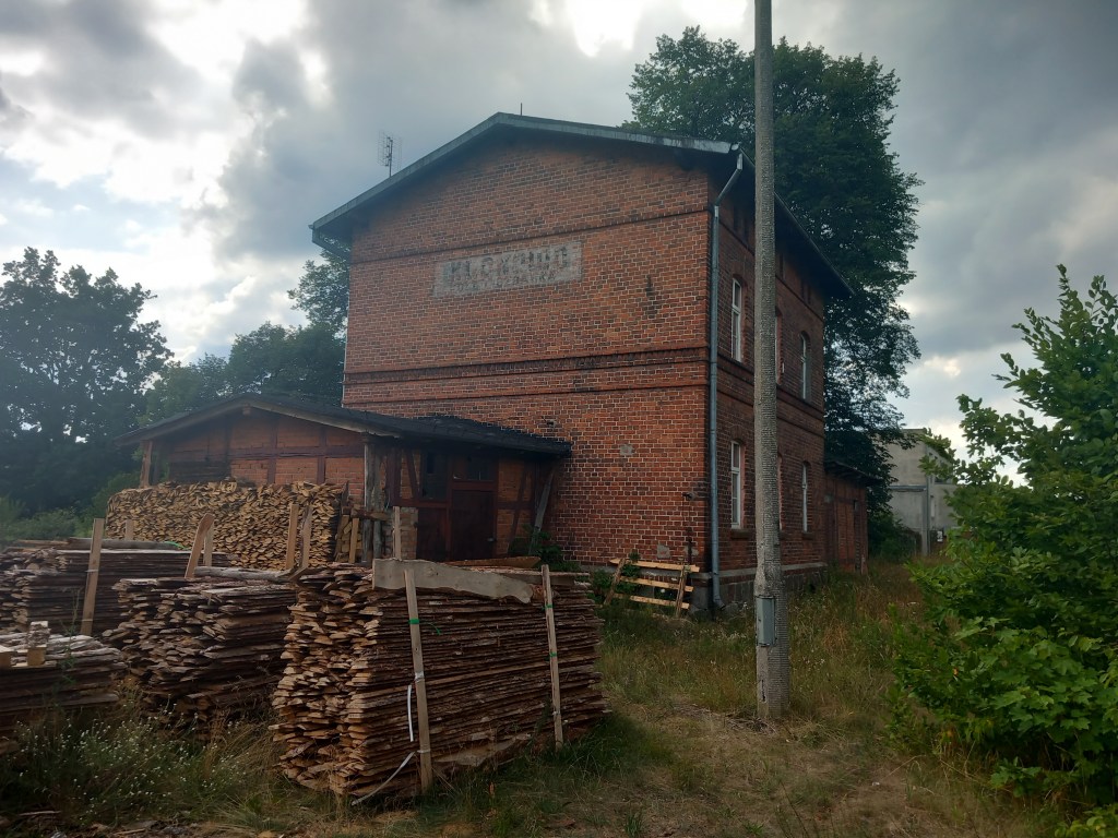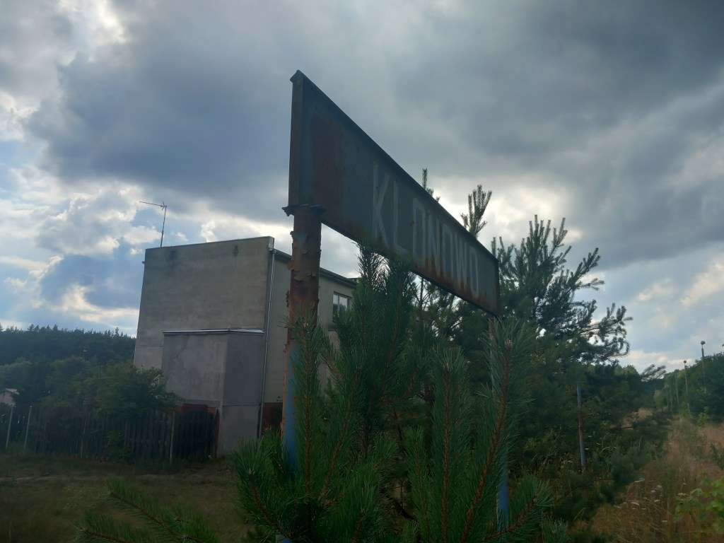 Wreszcie jezioro się kończy, szlak skręca w lewo i krótki jego odcinek prowadzi po bezdrożach, jednak zaraz dochodzimy do szerokiej asfaltowej szosy. Idziemy dalej asfaltem, po chwili mijamy zarośnięte torowisko linii 208. Za torami szlak skręca w lewo, a my idziemy w prawo kostkowaną drogą wzdłuż toru. Po 2 kilometrach wchodzimy do wsi Klonowo, przechodzimy przez nią i na jej końcu po lewej stronie mamy tartak, a po prawej stację kolejową Klonowo koło Lidzbarka. Oczywiście wszystko tam jest zarośnięte i opuszczone 😦