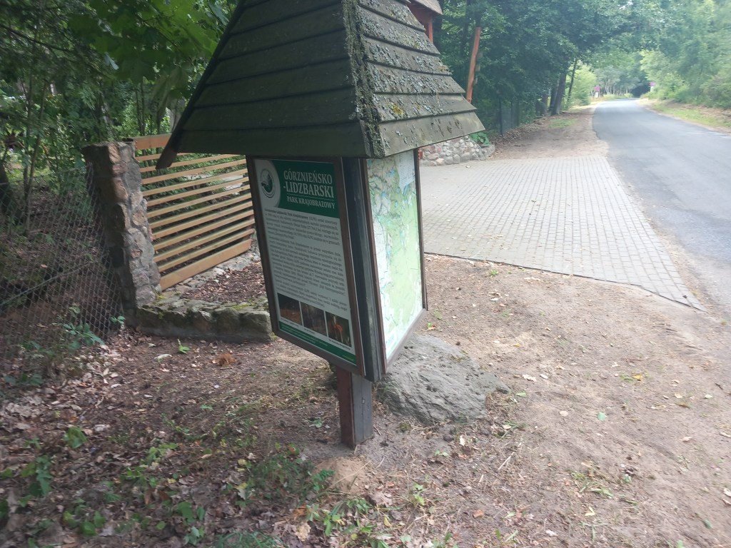 W centrum wsi szosa idzie prosto i przechodzi przez most, a my razem ze szlakiem skręcamy w lewo. Zaraz za mostem mijamy tabliczkę informacyjną o szlaku kajakowym wraz z miejscem postojowym. Idziemy dalej około 4 km razem ze szlakiem czerwonym w kierunku południowym i dochodzimy do kolejnej wsi o nazwie Kurojady.
