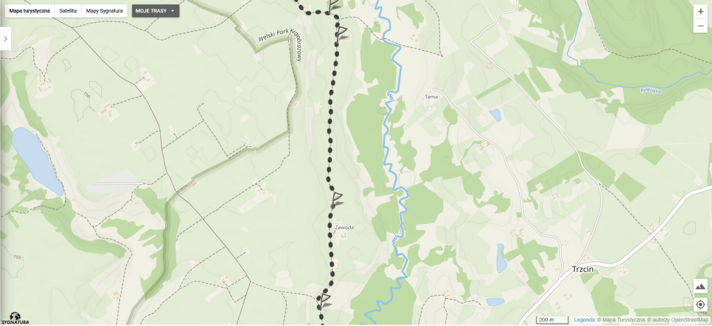 Wędrujemy taką drogą jeszcze kilka kilometrów, wreszcie skręca w prawo lekko pod górkę. Tam przechodzimy obok gospodarstwa, przed którym skręcamy w lewo. Dalszy odcinek trasy prowadzi również wzdłuż rzeki, jednak tym razem w troszkę większej odległości.