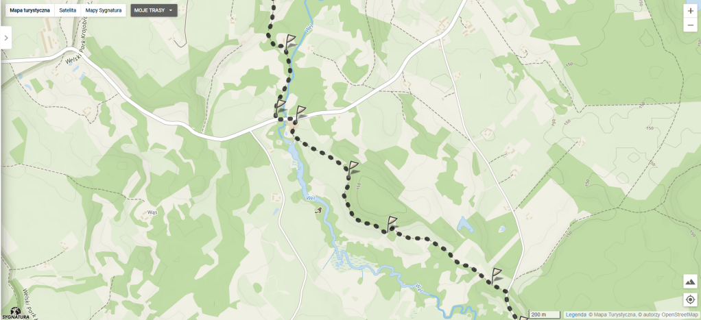 Po minięciu zabudowań mamy tabliczkę informującą nas, że wchodzimy na teren Welskiego Parku Krajobrazowego. Po około kilometrze widzimy przed nami most na Bałwance, która zaraz potem wpada do rzeki Wel.