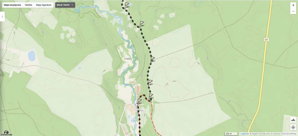 Dalej ścieżka trochę odbija od rzeki, jednak po kilometrze z powrotem się zbliża. Wreszcie dochodzimy do wsi Chełsty, gdzie dołącza do nas szosa z czerwonym szlakiem. Skręcamy w nią w prawo, droga robi zawijas w kształcie litery „U” i prowadzi dalej wzdłuż rzeki.