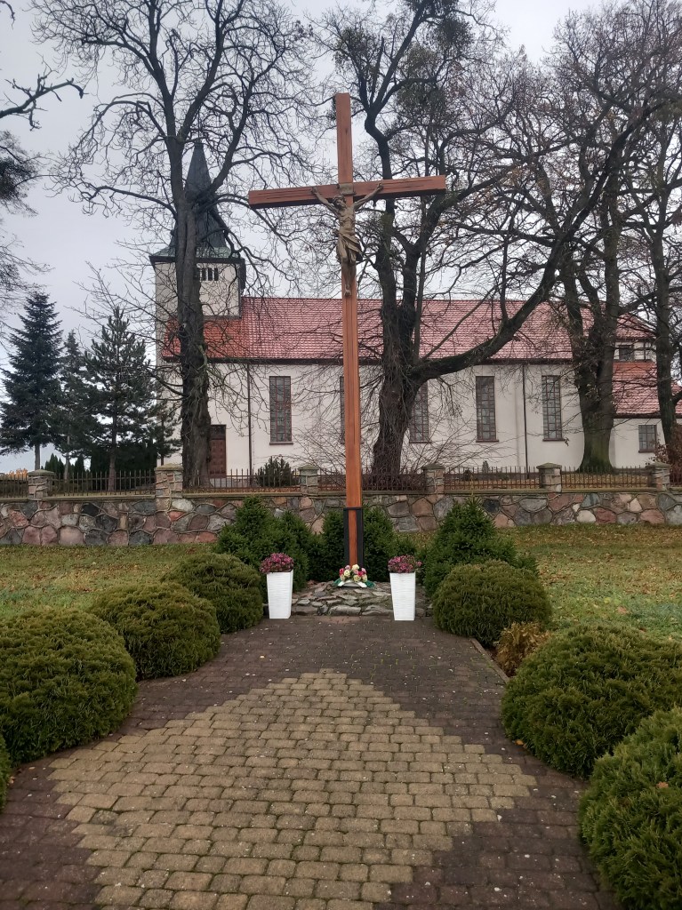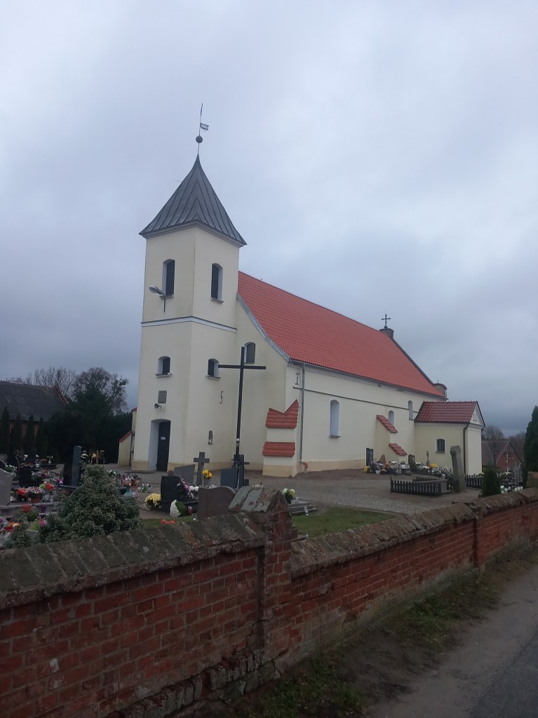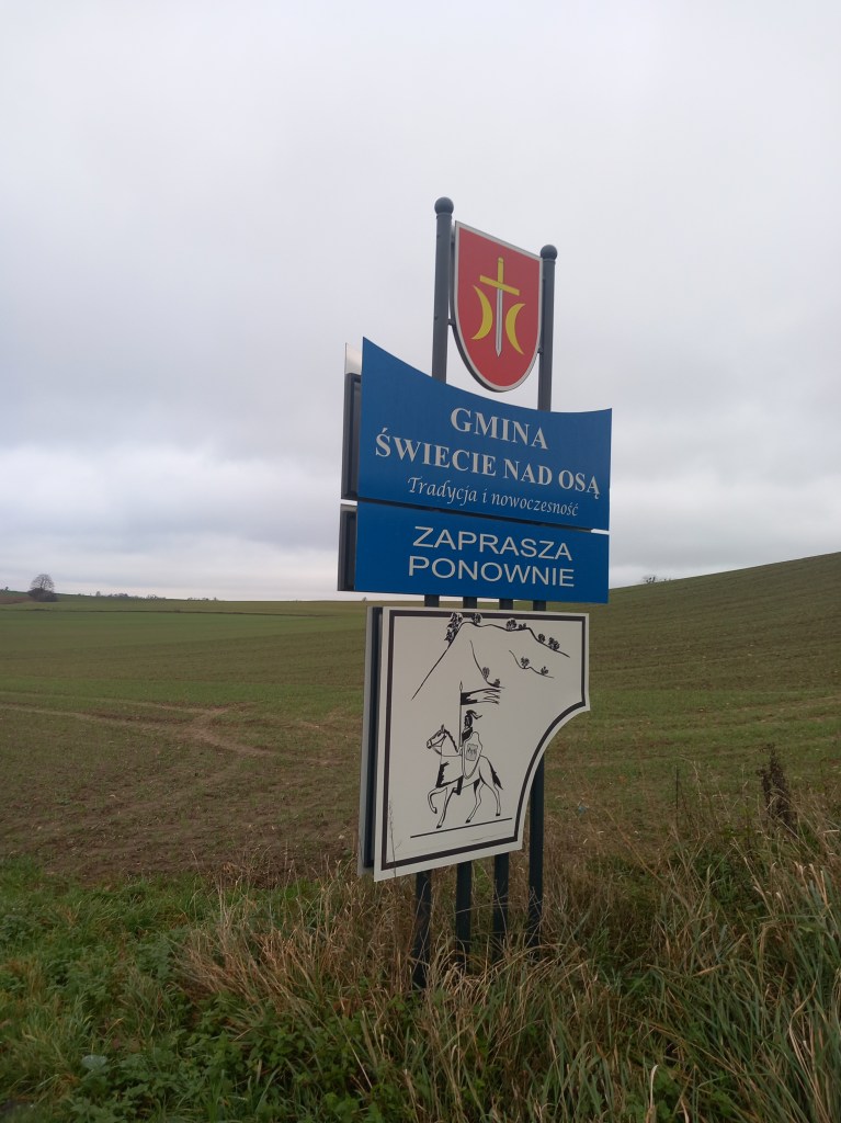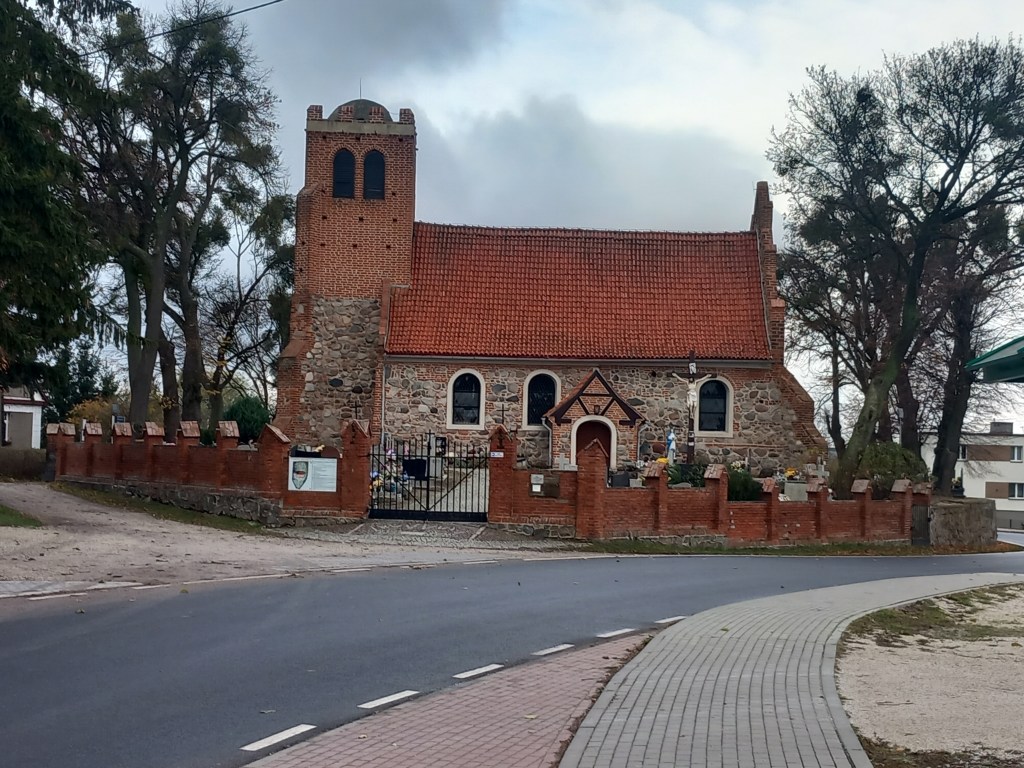 Przechodzimy przez wieś, mijamy po lewej stronie kościół pw. Świętego Jakuba. Potem mamy po prawej stronie znak drogowy informujący o spadku oraz wieżę telefonii komórkowej. Idziemy chwilkę w dół, po czym po lewej stronie dochodzi droga szutrowa, w którą skręcamy. Idąc dalej prosto szosą doszlibyśmy do głównej drogi krajowej 16, gdzie w razie gdyby ktoś był już zmęczony można iść łapać autobus w kierunku Grudziądza.