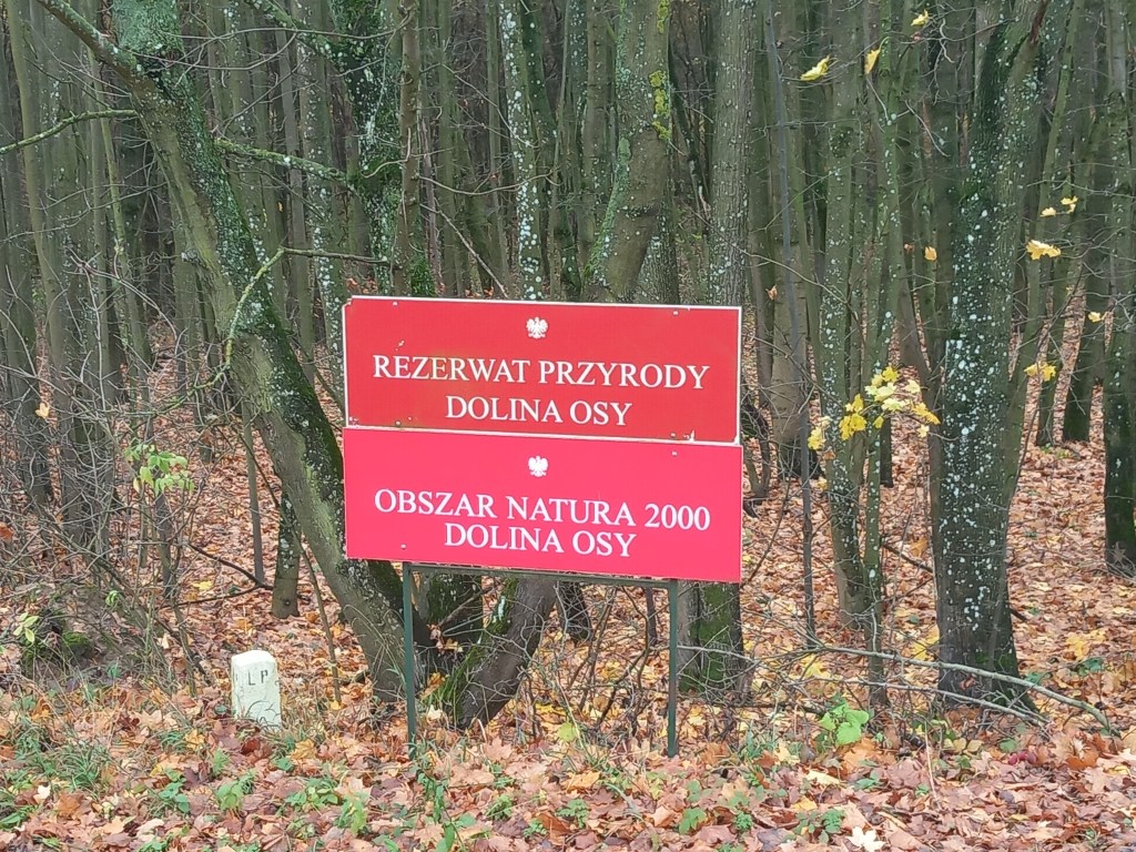 Jest to droga wojewódzka nr 538, idziemy nią około 4 km, do momentu ujrzenia po lewej stronie tablic Rezerwatu Dolina Osy.