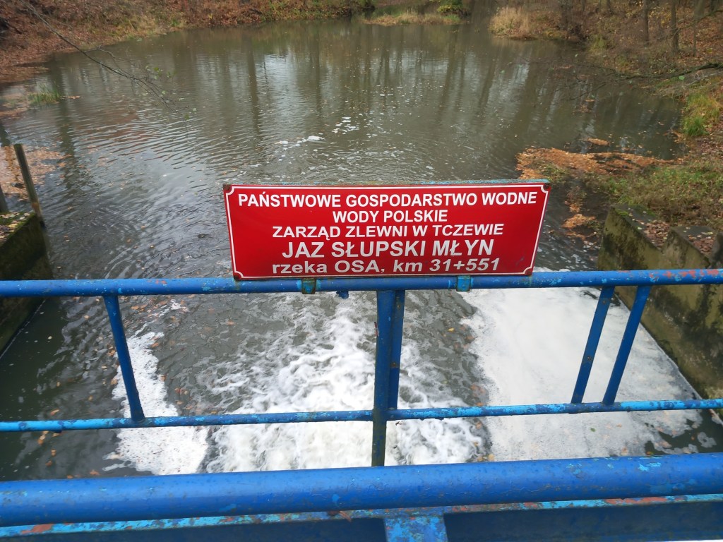 Tam skręcamy zgodnie ze znakami szlaku żółtego w prawo, oczywiście na tej mapie tego szlaku nie ma 😀 Mijamy mostek na Osie wraz z jazem i młynem we wsi Słupski Młyn.