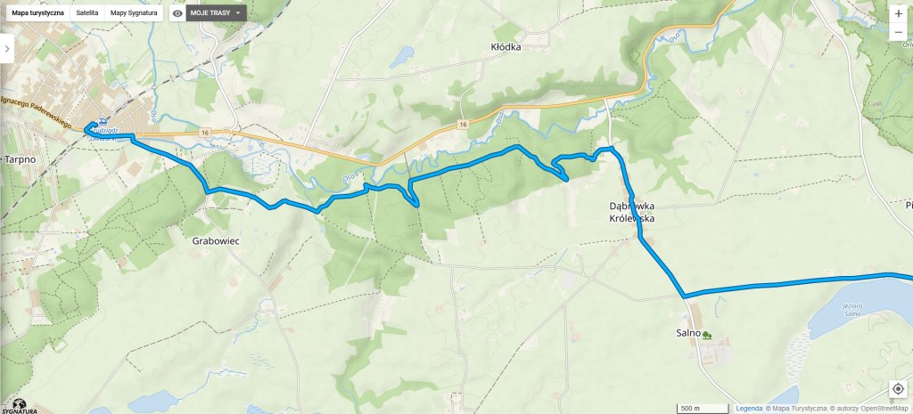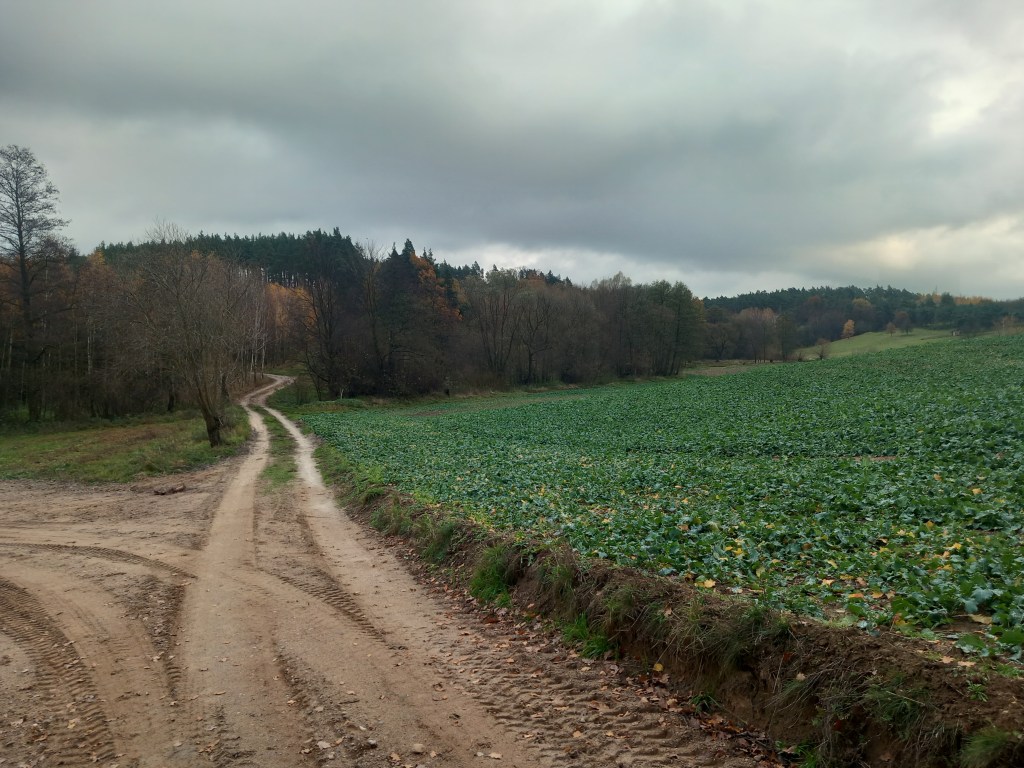 Teraz rozpoczyna się najciekawszy moim zdaniem odcinek naszej wycieczki, idziemy leśnym pofałdowanym terenem, jeśli warunki pogodowe są sprzyjające, to przy okazji możemy pozbierać grzyby. Warto często sprawdzać w telefonie lokalizację, gdyż szlak jest słabo oznakowany na drzewach. Idziemy przez osadę Karasek, następnie przez wieś Orle nad Jeziorem Salno.