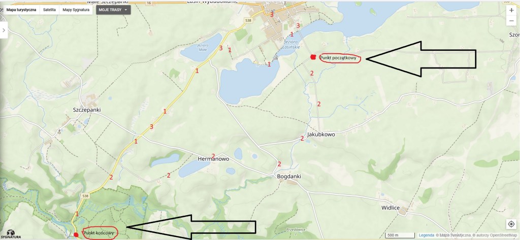 Jak widzimy najszybsza jest opcja nr 2, która prowadzi od mostu na południe przez Jakubkowo, Bogdanki i Hermanowo, jednak jednocześnie jest tu najwięcej asfaltu, więc kwestia chęci i dobrych butów. Opcja pierwsza i trzecia niewiele się różni, z tym że ostatnia prowadzi przez miasto Łasin, w którym można zaopatrzyć się w prowiant, oraz zwiedzić samo miasto. Ja osobiście wybrałem opcję numer jeden: zaraz za mostem w lewo i bulwarem wzdłuż jeziora przez kąpielisko z pomostem do opuszczonego ośrodka wypoczynkowego przy ulicy Sportowej i dalej polną ścieżką do głównej drogi.