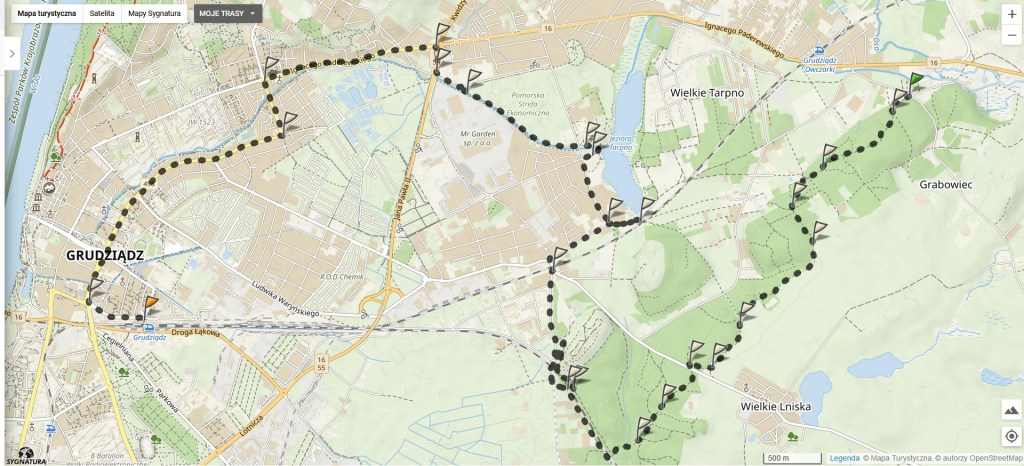 Zatem kolejna trasa prowadzi ze znanego już nam Ostrowitego koło Jabłonowa do Grudziądza. Dojazd z Brodnicy był już kiedyś podany, jednak pozwolę sobie go przypomnieć. Z miasta nad Drwęcą dojeżdżamy pociągiem Arrivy do Jabłonowa Pomorskiego, następnie przesiadamy się w pociąg Przewozów Regionalnych (czy jak kto woli PolRegio) w kierunku Iławy i wysiadamy na pierwszej stacji. Najlepiej na tę wycieczkę wyruszyć w tygodniu, gdyż w weekend kursuje tam znacznie mniej pociągów i można nie zdążyć przed zachodem słońca. Wysiadamy na znanej nam już stacji Ostrowite, jednak do tej pory zawsze przechodziliśmy przez tory i szliśmy w prawo szlakiem żółtym lub niebieskim. Tym razem skręcamy w lewo i kierujemy się szlakiem zielonym. Szlak ten zaczyna się w samym Ostrowitem i prowadzi aż do Radzynia Chełmińskiego, miasta znanego z ruin zamku, gdzie kręcono między innymi popularny film dla dzieci Pan Samochodzik i Templariusze. Jednak do Radzynia dojdziemy podczas innej wycieczki. Ogólnie z Ostrowitego do Grudziądza można przejść kilkoma drogami, zarówno od południa jak i od północy. Długość tras wynosi od 42 do 62 km. Dziś przyjrzymy się wariantowi północnemu, który jest jednocześnie najkrótszy. Przy okazji warto wspomnieć, że na niektórych starszych mapach nie ma zaznaczonych szlaków, którymi prowadzi dzisiejsza trasa, dlatego trzeba mieć się na baczności, żeby się nie zgubić. Ja korzystam z aplikacji Mapa Szlaków Turystycznych, gdzie jest tylko szlak zielony, a dalszych nie ma; dlatego warto również zaopatrzyć się również w aplikację Szlaki, gdzie baza jest znacznie bardziej pojemna.