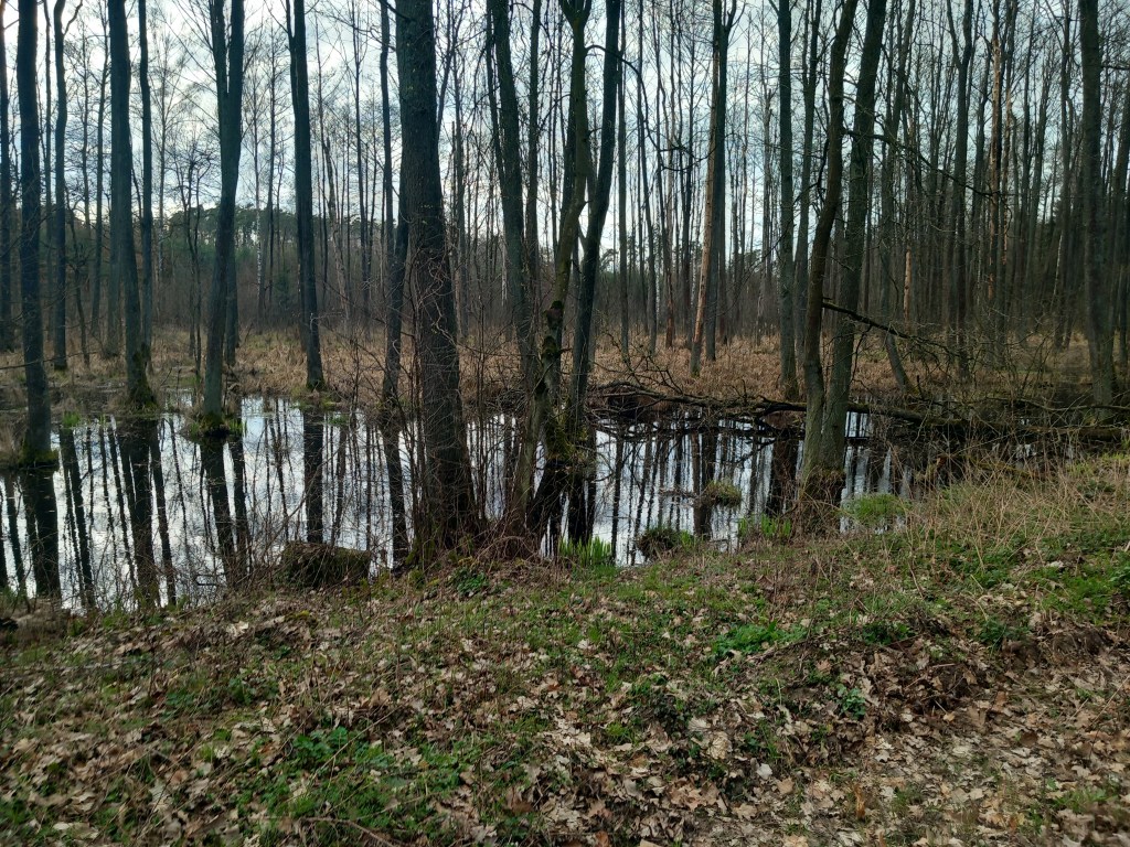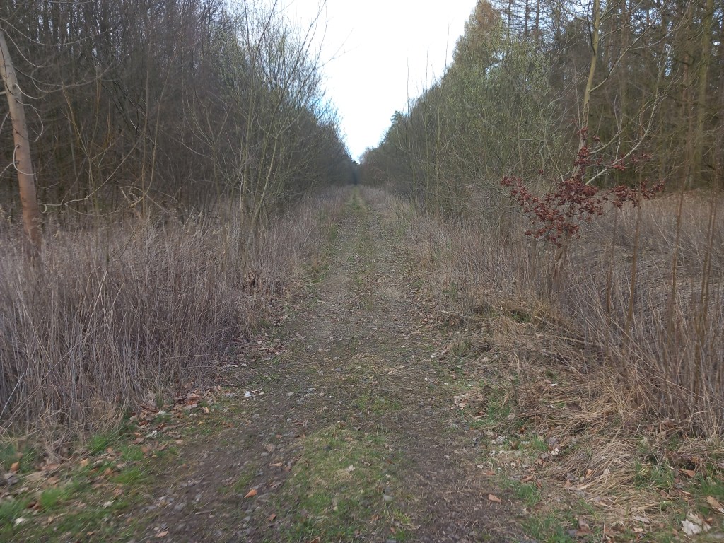 Na początku po obu stronach mijamy pagórkowate pola, jednak po około pół kilometra, krajobraz po lewej zmienia się w las. Ogólnie idąc starotorzem nie sposób się zgubić, jednak nie warto ufać mapom internetowym, bo na wielu jeszcze jest tor. Linia została zaorana, a mówiąc po kolejowemu uległa fizycznej likwidacji w czerwcu 2017 roku na odcinku Brodnica – Kowalewo Pomorskie, więc widać, że aplikacje nie są aktualizowane. O mapach papierowych nie wspominam, gdyż większość została wydana przed rokiem 2015. Idziemy śladem dawnego toru na początku w rowie, potem na nasypie. Po obu stronach można zauważyć podtopienia, jednak przypuszczam, że jest to spowodowane wysokim stanem wody o tej porze roku i zapewne jest to chwilowe zjawisko. Po około 2 kilometrach mijamy przejazd kolejowy z ulicą Siewną, którą kiedyś szliśmy przez Drużyny i Kruszynki do Lisa Młynu.
