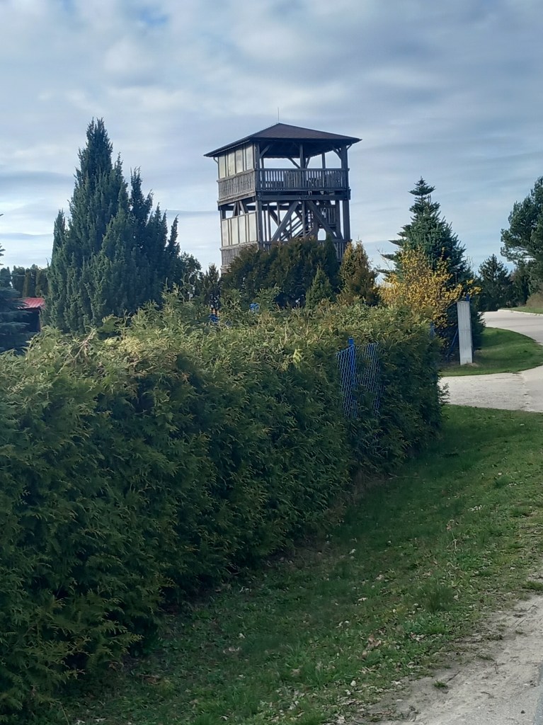 Po dojściu do skrzyżowania, po prawej stronie naszym oczom ukazuje się jezioro Chojno. Na początku mijamy domki letniskowe, następnie parking z zejściem na plażę. Na końcu parkingu mamy jeden z punktów naszej wycieczki, mianowicie wieżę widokową, z której roztacza się piękny widok na jezioro i okoliczne tereny.