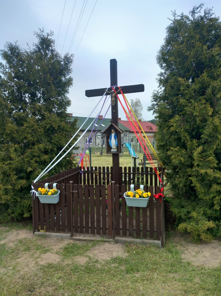 Skromny drewniany krzyżyk z Wardęgowa. Ale tyle wystarczy, bo z tyłu znajduje się sanktuarium Maryjne.