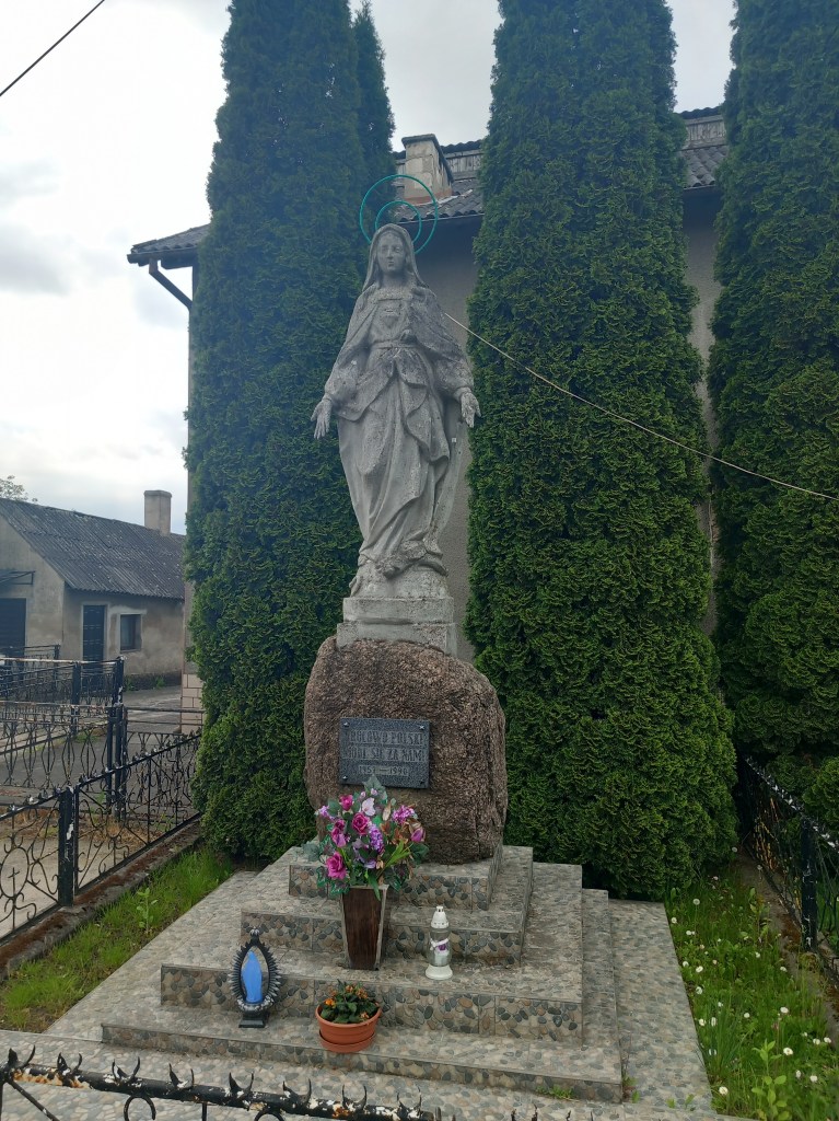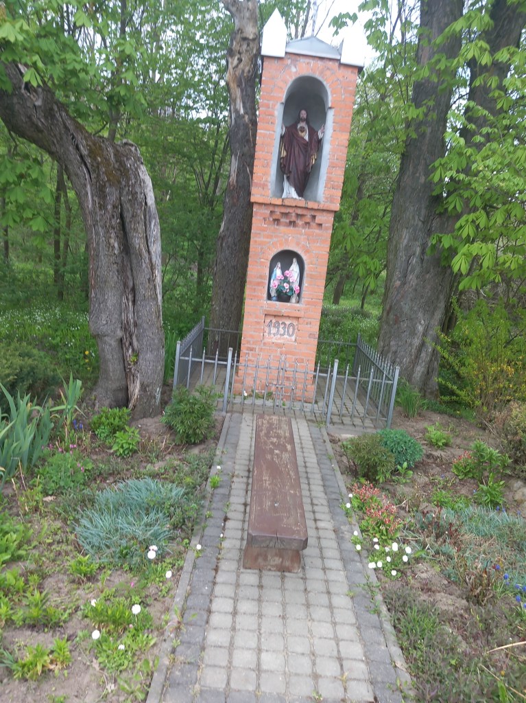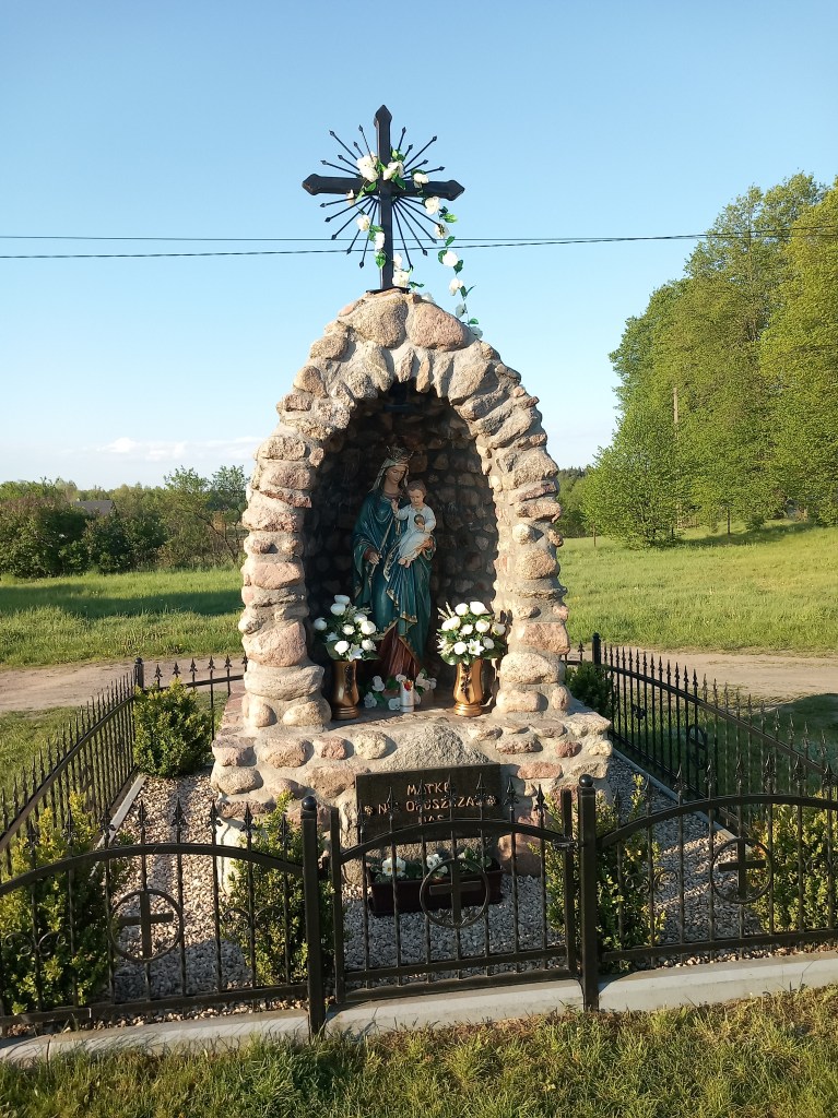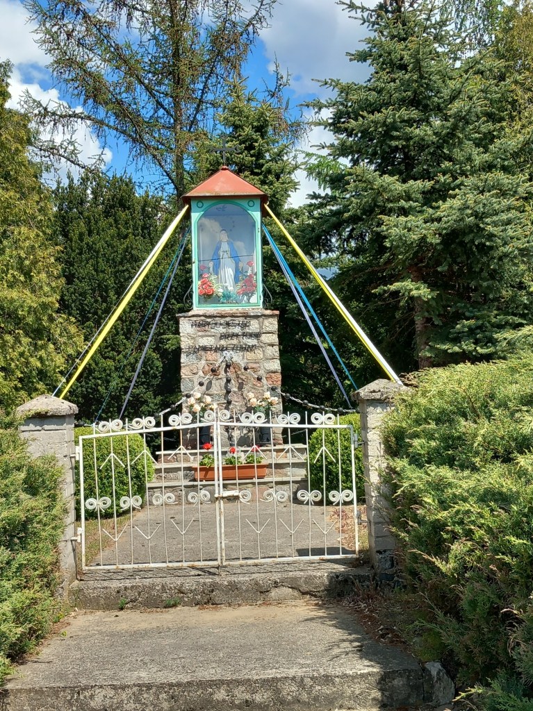 Dobra, opuszczamy Łąkorz i idziemy dalej. Zawędrowaliśmy do Szwarcenowa. Prawa strona zdjęcia trochę zasłonięta, ale to nie szkodzi. Oryginalna Maryja w czymś w rodzaju groty. Figurka stoi pod kościołem. Data ta sama, 20 maja 2023.