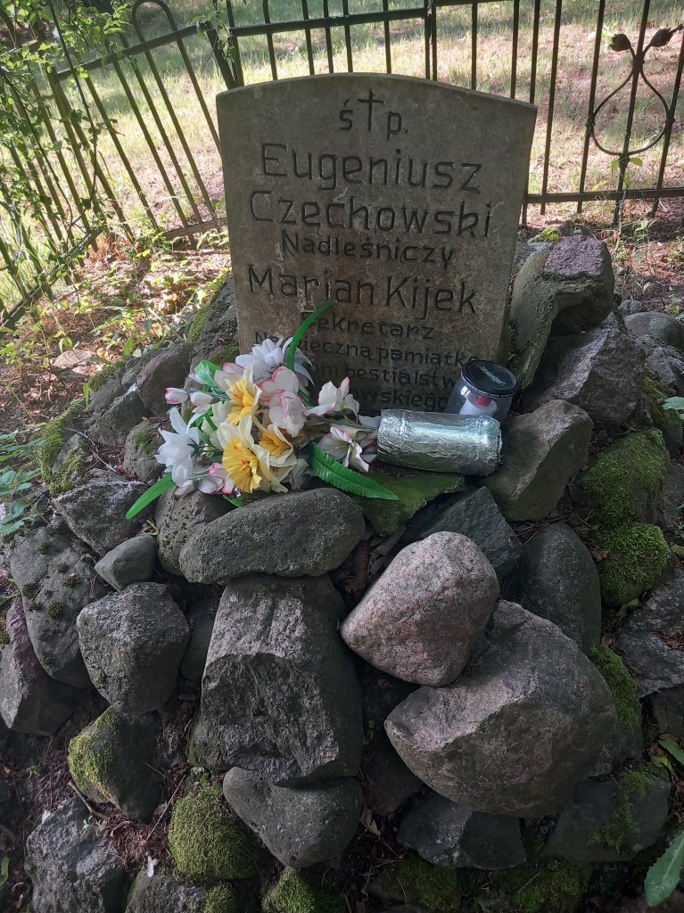 Wyżej wymienioną wojewódzką dochodzimy do Luchowa i póki co maszerujemy zgodnie ze znakami zielonego szlaku. Zatem po kilkuset metrach skręcamy w lewo w stronę Czerwińska (nie mylić z Grodami Czerwieńskimi znanymi nam z historii Polski). Po kolejnym kilometrze po prawej stronie mijamy leśniczówkę Dębowo z pamiątkowym pomnikiem/grobowcem leśniczych poległych podczas wojny. Zaraz za tym obiektem jest skrzyżowanie, zielony szlak idzie dalej prosto, a my skręcamy w czarny, który ma tu swój początek. W tym miejscu chciałbym obalić pewien mit, który krąży wśród turystów. Mianowicie – kolor szlaku pieszego oznacza jego trudność. W sensie, że im ciemniejszy szlak, tym trudniejszy. Są to plotki wyssane z palca, wzięły się zapewne z faktu, że tak to działa w przypadku szlaków narciarskich. A jeśli chodzi o piesze, to ich kolory mają jedynie za zadanie odróżnienie ich od reszty.