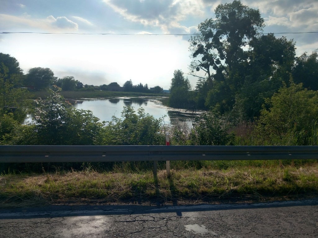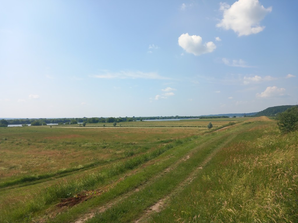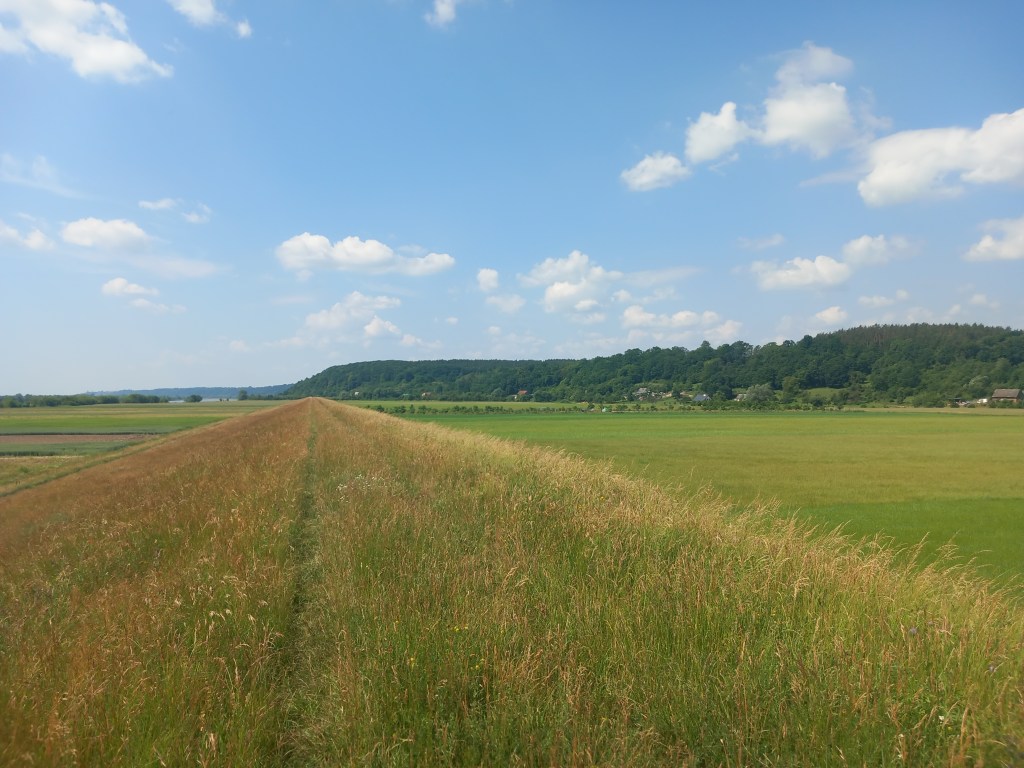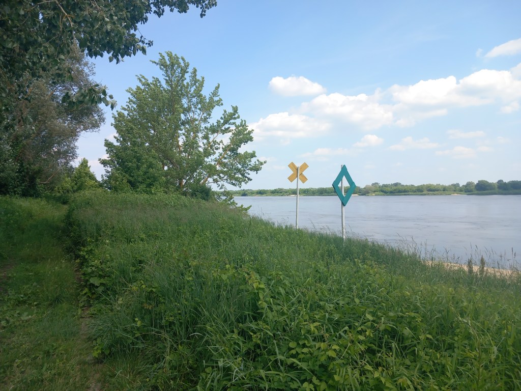 Kolejny etap, właściwie prawie do końca prowadzi płasko po asfalcie. Z jednej strony wiadomo, asfalt, ale z drugiej jest to odskocznia od poprzednich wzgórz, bezdroży i lasów. Muszę tu wspomnieć, że spodziewałem się, że będzie to jedynie ścieżka rowerowa, jednak niestety ruch samochodowy też nam towarzyszy 😀 Istnieje również alternatywna opcja, można maszerować środkiem wału przeciwpowodziowego, który cały czas mamy w bliskiej odległości po lewej stronie. Jednak tam wszystko zarośnięte i marsz utrudniony, więc z dwojga złego już wolę ten asfalt (muszę zapisać w kalendarzu, że chwalę tę nawierzchnię).