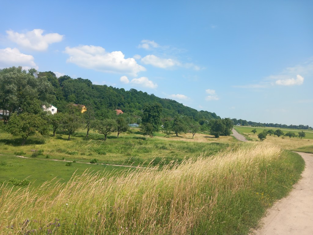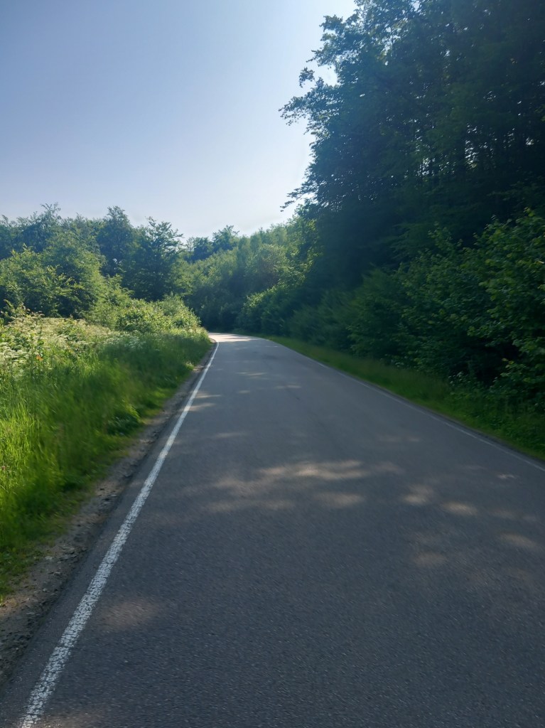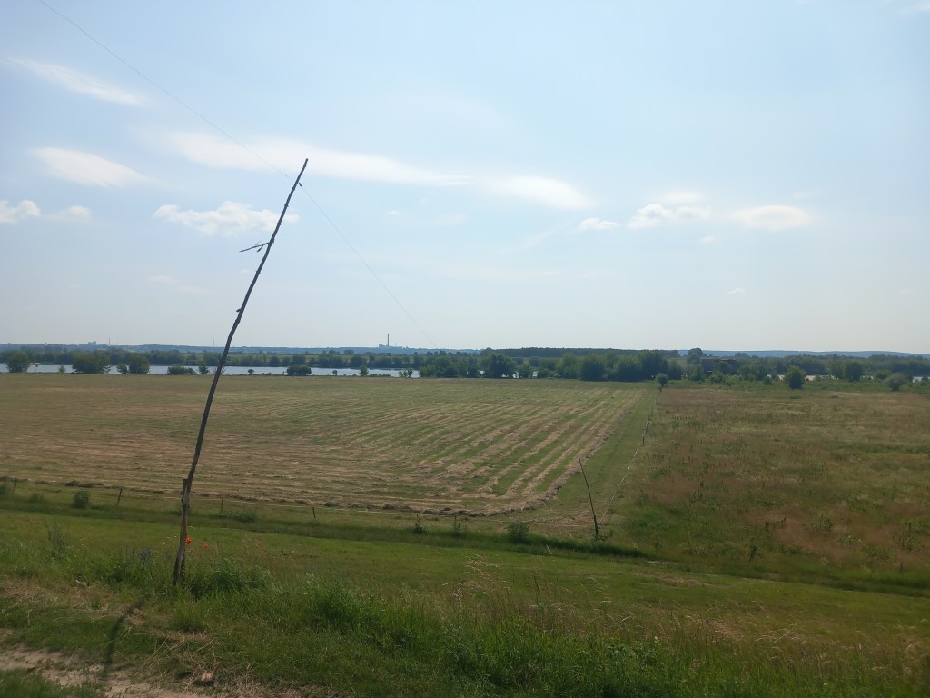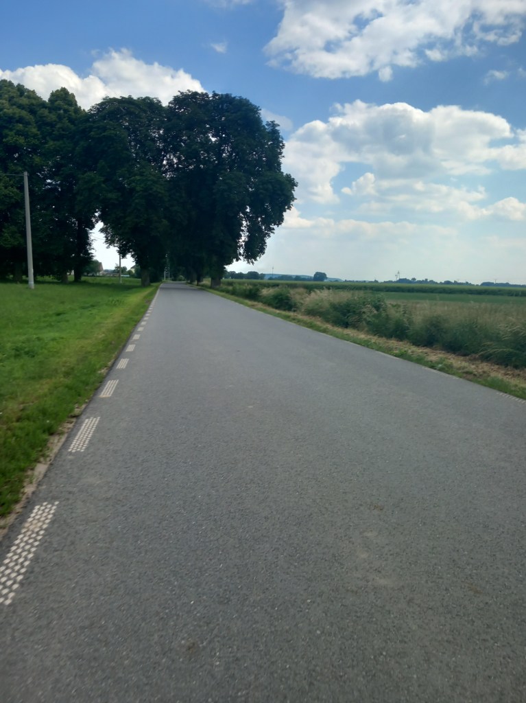 Kolejny etap, właściwie prawie do końca prowadzi płasko po asfalcie. Z jednej strony wiadomo, asfalt, ale z drugiej jest to odskocznia od poprzednich wzgórz, bezdroży i lasów. Muszę tu wspomnieć, że spodziewałem się, że będzie to jedynie ścieżka rowerowa, jednak niestety ruch samochodowy też nam towarzyszy 😀 Istnieje również alternatywna opcja, można maszerować środkiem wału przeciwpowodziowego, który cały czas mamy w bliskiej odległości po lewej stronie. Jednak tam wszystko zarośnięte i marsz utrudniony, więc z dwojga złego już wolę ten asfalt (muszę zapisać w kalendarzu, że chwalę tę nawierzchnię).
