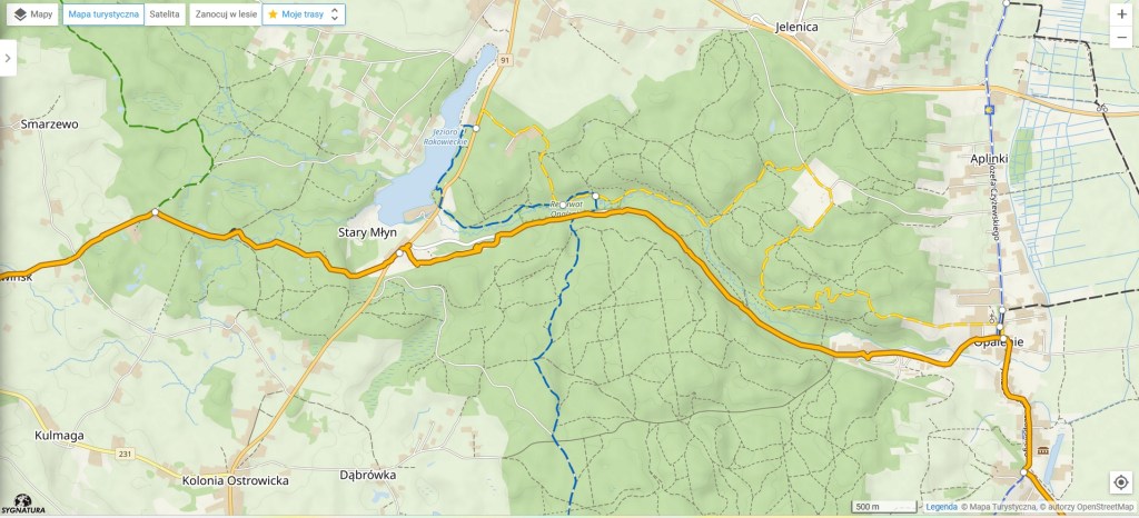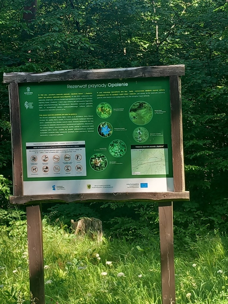 Ogólnie w tym miejscu (jakże często padają te słowa na moim blogu) planowałem iść niebieskim i żółtym szlakiem, jednak trochę by za daleko wyszło, a tak znalazłem trasę wzdłuż naszej dwieście trzydziestki ósemki. Załączam mapkę, która wszystko wyjaśnia. W sumie dobrze, że tak wyszło, bo po drodze natknąłem się na dawną stację Mała Karczma, oraz na ruiny wiaduktu nad tą linią. Ten odcinek trasy prowadzi asfaltową leśną drogą, jednak ruch jest dosyć mały. Po kilku kilometrach dochodzimy do Opalenia (taka nazwa wsi), po drodze po lewej stronie mamy rezerwat przyrody, stanowi on formę ochrony dla pluskwicy europejskiej, paprotnika kolczystego i groszku wieloprzylistkowego.