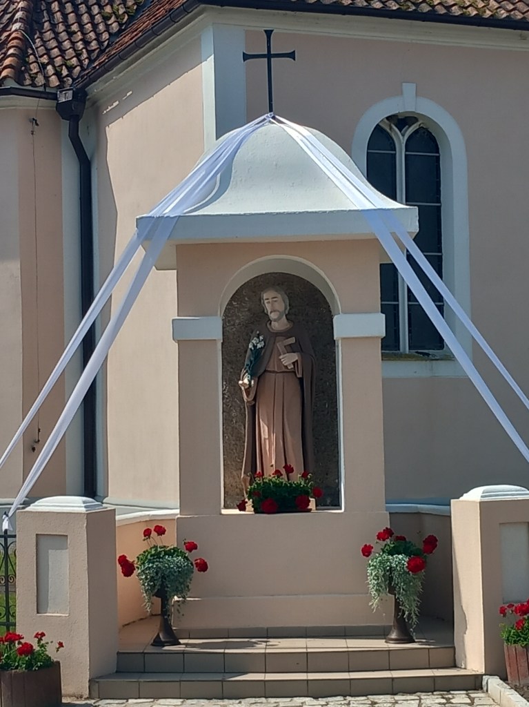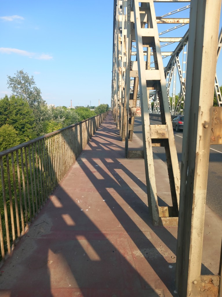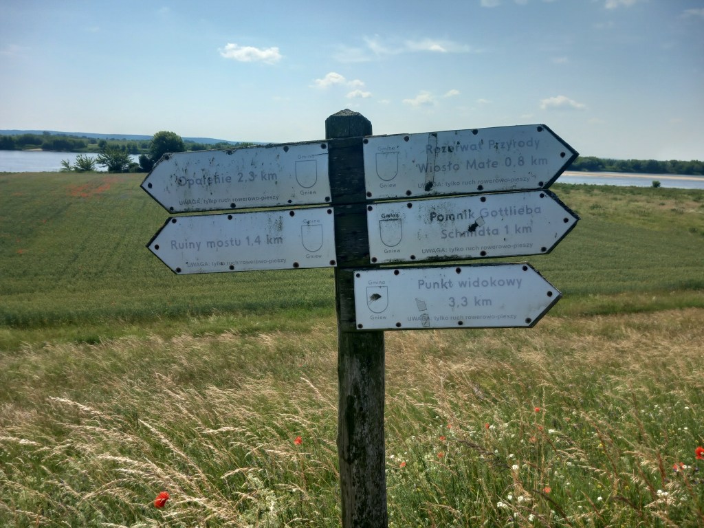 W Opaleniu również znajdują się ruiny dawnej stacji kolejowej, jednak obecnie jest to teren prywatny, więc wejście niemożliwe. Dochodzimy do centralnego skrzyżowania, tuż przed nim po lewej stronie mamy stary ceglany młyn. Dochodzą do nas szlaki: Camino, żółty oraz czarny. Ten ostatni i muszelka będą nam teraz towarzyszyć przez dłuższy czas. Za skrzyżowaniem jest również Plac Świętego Józefa wraz z jego rzeźbą, oraz kościół pw. Świętych Apostołów Piotra i Pawła. Stoi tam również drogowskaz, gdzie możemy sprawdzić ile kilometrów już przeszliśmy i ile zostało. Idziemy dalej ulicą Czapskiego, przechodzimy pod dawną linią kolejową (a jakże, nr 238), za którym muszelka prowadzi prosto, my jednak skręcamy w lewo wraz ze szlakiem czarnym wzdłuż pozostałości toru. Po niecałym kilometrze docieramy wreszcie do Wisły, która to będzie naszym towarzyszem praktycznie do końca wycieczki. Do tej pory maszerowaliśmy głównie na zachód, od teraz głównym kierunkiem jest południe. Wchodzimy pod górkę na wał przeciwpowodziowy, którym będziemy szli około kilometra. Wał jest trochę zarośnięty, więc tępo spada, ale da się przejść. Wcześniej jednak można rozkoszować się panoramą na Wisłę i jej drugi brzeg, na pierwszym planie widzimy między innymi miasto Kwidzyn wraz z zamkiem, a dalej nawet zamek w Malborku. Ogólnie rzecz biorąc, jeszcze będzie kilka interesujących punktów widokowych, jednak ten zachwycił mnie szczególnie, bo był pierwszy z kolei 😀 Oprócz drugiego brzegu, znajdują się też tu ruiny mostu kolejowego na naszej linii kolejowej, na środku stoją dawne przyczółki. Wyczytałem w Internetach, że większość tej przeprawy została wykorzystana do budowy mostu drogowego w Toruniu znanego z nam z tej wycieczki (https://maronwedruje.com/2024/05/11/szlak-zolty-5-golub-dobrzyn-torun/)