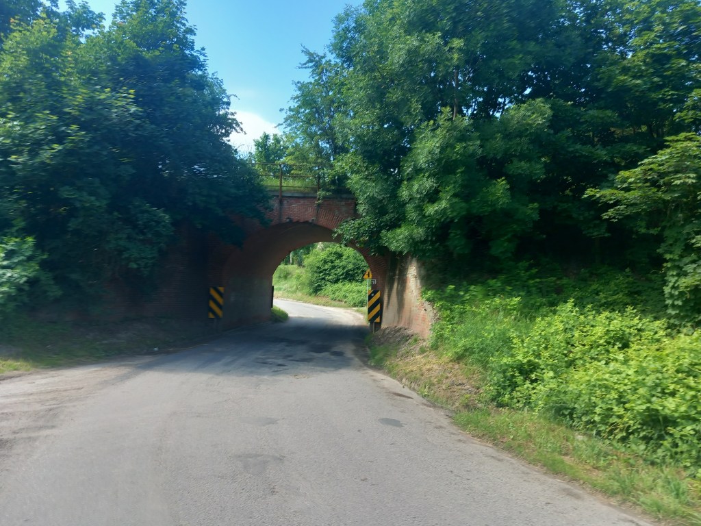 Zatem wracając do meritum, wędrujemy teraz czernią na zachód. Po chwili napotykamy wiadukt, który wyglądem przypomina raczej tunel znany brodniczanom z księżego lasku. Jest to pierwszy (zapewniam Was, że nie ostatni) wiadukt na wspomnianej wyżej linii 238. Przechodzimy pod pozostałościami toru i dalej idziemy lasem. Po dwóch kilometrach (tak jak mówi drogowskaz przy leśniczówce) docieramy do leżącej przy drodze krajowej nr 91 wsi Mała Karczma. Droga ta stanowi starą trasę z Gdańska na Śląsk, obecnie główną arterią jest autostrada A1, zwana bursztynową, jednak tu nadal panuje spory ruch. Obok Małej Karczmy jest również Stary Młyn, ciekawa zbieżność nazw 😀 Przechodzimy przez szosę, po lewej stronie mijamy Pałac Kończewskich, gdzie obecnie znajduje się agroturystyka. Przy mijaniu jezdni, warto spojrzeć w prawo, bo tam stoi kolejny wiadukt linii 238, tym razem taki normalny.