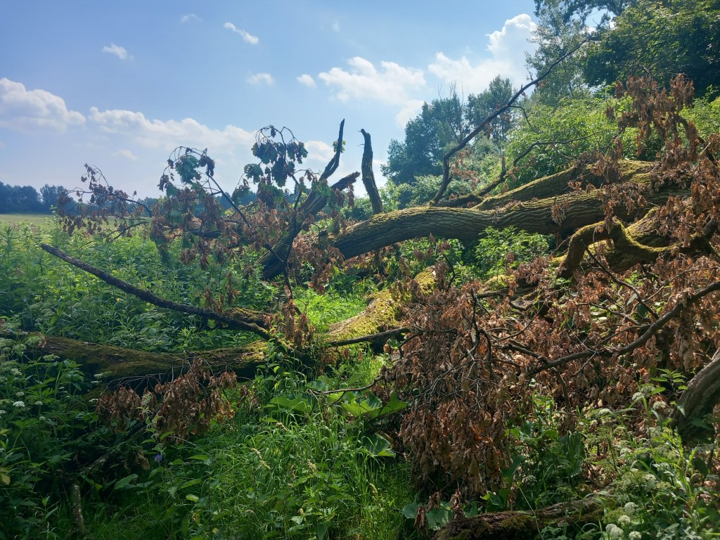 W ogóle ten odcinek jest dosyć kręty i pagórkowaty, w jednym miejscu nawet zgubiłem na chwilę szlak (prowadził wąskim wąwozem, a ja poszedłem dookoła ścieżką rowerową). W tym miejscu również znajduje się granica województw, zatem wchodzimy do kujawsko-pomorskiego (home, sweet home!). Teraz około 2 kilometrów mamy trochę wytchnienia, szlak prowadzi prawie prosto, po prawej stronie gnie nie gdzie prześwituje nam Wisła. Docieramy do wsi Kozielec, gdzie (oczywiście bez znaków, co na tej trasie jest ewenementem, bo do tej pory wszystko było czytelne i wyraźne) szlak nagle i niespodziewanie skręca ostro w lewo. Przechodzimy wśród zabudowań gospodarskich, między innymi stoi tam stara ceglana stodoła i… znowu zaczyna się stromy etap prawie bezdrożami. Schodzimy prawie 40 metrów ku Dolinie Wisły. Jednak wertepy, to mały pikuś w porównaniu z tym, co spotka nas na dole. Mianowicie niedaleko stawu na środku drogi leży zwalone drzewo. Niestety jest sporych rozmiarów i nie da się go obejść bokiem. Jedynym sposobem jest przejście górą przechodząc po konarach (uwaga na pokrzywy). Drzewo jest już porośnięte mchem, przez co jest też dosyć śliskie, także podwójnie należy zachować ostrożność. Świadczy to też, że leży już jakiś czas. Jednak jak wiemy z ostatniej wycieczki (https://maronwedruje.com/2024/05/31/szlak-zielony-3-kowalewo-jablonowo/) często PTTK na w głębokim poważaniu przebieg szlaku i bezpieczeństwo turystów 😀