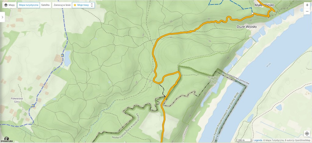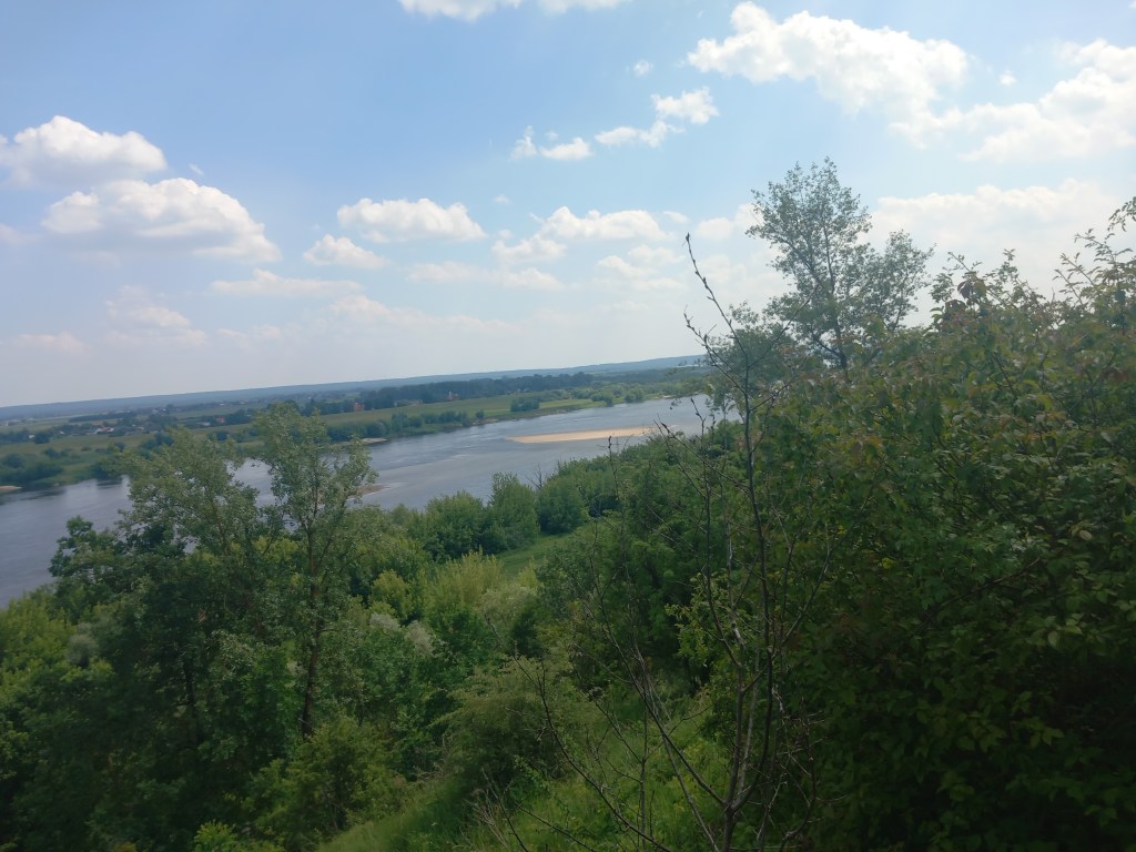 Po zejściu z wału przez chwilę wędrujemy drogą z kostki w kształcie plastrów miodu, po czym schodzimy w dół kilkoma serpentynami, które prowadzą ulicą Jabłoniową. Po minięciu zrujnowanej chatki szlak skręca w prawo, gdzie mamy pierwsze na naszej trasie dosyć strome podejście. Mijamy Rezerwat Wiosło Małe (znajdują się tu wsie Małe Wiosło i Duże Wiosło), następnie jest zejście ze szlaku do obelisku pamięci Gotlieba Schmidta (ja jednak byłem pochłonięty szlakiem i go ominąłem). Cały czas nasza trasa prowadzi w kolorach czerni (w sensie czarnym szlakiem), po chwili znowu dołącza do nas muszelka i mamy asfalt, jednak tylko na chwilę, bo po kilometrze szlak ostro skręca w lewo z górki. Znajduje się tam tablica Małe Wiosło. Jakiś czas idziemy wąską ścieżką, po lewej stronie mamy dwa domki wypoczynkowe. Za zabudowaniami należy uważać, przed sobą mamy zrujnowany domek, która przywodzi na myśl chatkę Shreka (co prawda nie ma na dachu starego pnia, ale obok podobnie jak w bajce znajduje się mały wychodek). Jednak przed tym szlak skręca w prawo, ciężko jest to miejsce przegapić, nawet na słupie jest wykrzyknik wraz z czarnym znakiem. Droga prowadzi teraz stromo pod górkę, początkowy etap jest zarośnięty kopro podobnymi roślinami, następnie trzeba pokonać kilka zwalonych pniaków drzew. Jednak te trudy wynagradza to co jest na szczycie, mianowicie wieża widokowa, z której rozpościera się kolejna panorama na Wisłę i okolice. Wstawiam zdjęcia, więc możecie sobie porównać który widok Wam najbardziej odpowiada. Po zejściu z wieży znowu mamy drogowskazy z kilometrami, następny odcinek przebiega wąską zarośniętą ścieżką, która tym razem prowadzi w dół. Po kilku zakrętach docieramy wreszcie do przyjemnej dwupasmowej ścieżki, gdzie mamy również znaki czarnego (no bo jakiego by innego?) szlaku rowerowego.