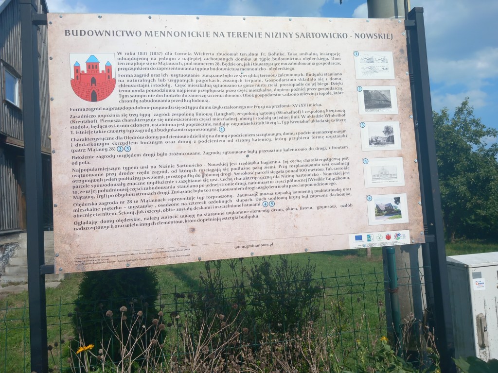 Oczywiście trasa ta ma też swoje zalety. W razie gdyby nas dopadło nagłe zmęczenie czy coś, to praktycznie to 2-3 kilometry znajdują się przystanku autobusowe, gdzie można sobie przysiąść i trochę zregenerować siły. W początkowej fazie towarzyszy nam także aleja lipowa, które są pomnikami przyrody. Po minięciu Nowego mamy wieś o nazwie Tryl (z angielskiego „Thrill”, he he he. Nie no, taki żarcik sytuacyjny, nie wiem skąd się wzięła ta nazwa). Wiem jednak na pewno, że kiedyś osiedlili się tu osadnicy holenderscy, którzy mieli za zadanie zagospodarowanie obszarów w Dolinie Wisły. Do dziś zachowały się zabytkowe podcieniowe chatki, oraz dawny cmentarz. Zarówno jedno jak i drugie znajduje się przy głównej drodze, więc nie mam mowy o zgubieniu 😀