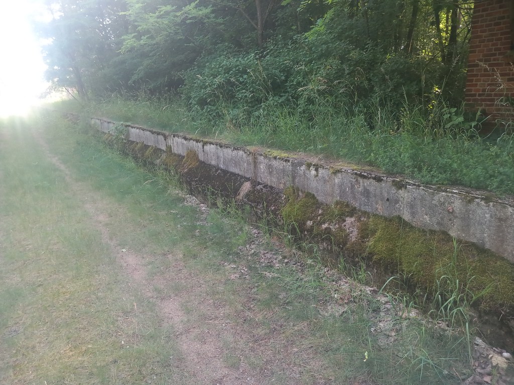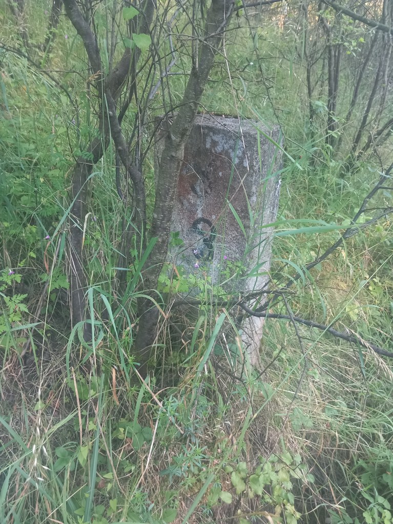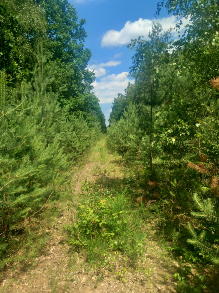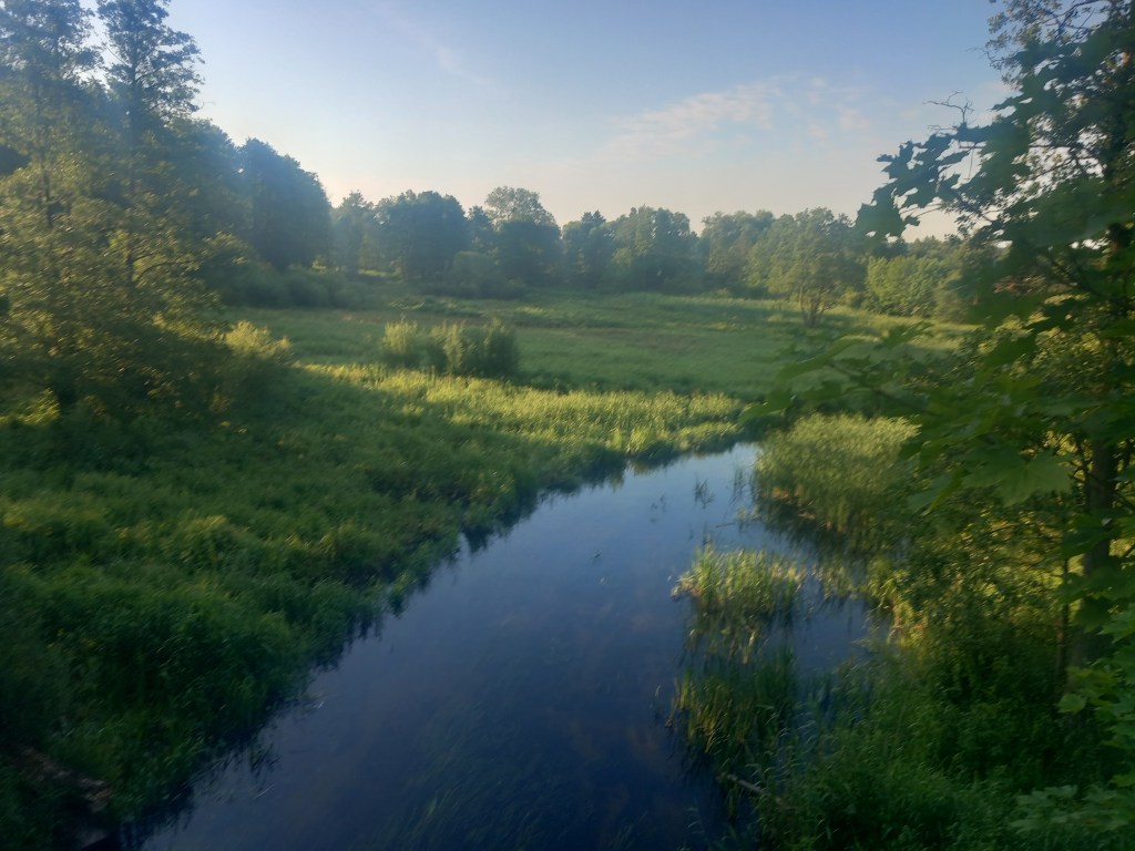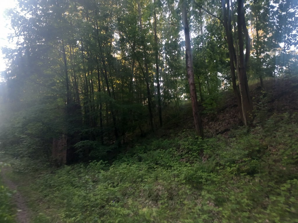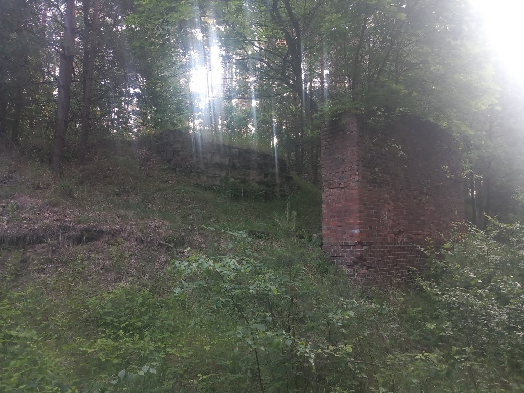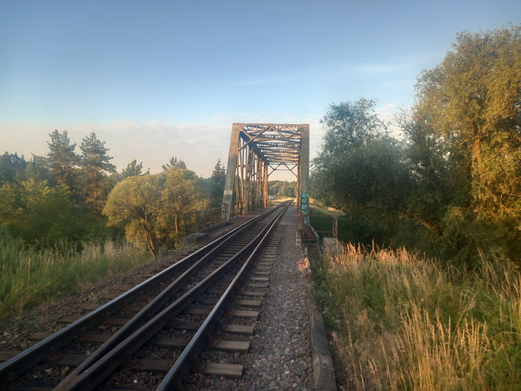 Zatem spod zarośniętego budynku stacji Tama Brodzka idziemy prosto krajową pietnastką, mijamy dwie knajpy, a po około pół kilometra skręcamy w prawo, wraz z zielonym szlakiem prowadzącym do Górzna (https://maronwedruje.com/2023/07/15/szlak-zielony-gorzno-brodnica/). Jednak szlak idzie dalej w miarę szeroką drogą do kolejnego mostu na Drwęcy, a my wybieramy wąską ścieżkę w lewo. Zejście znajduje się mniej więcej na wysokości drogowskazu „Nowy Dwór 1”. Szerokość drogi na tym odcinku nie zachęca do marszu, ale trudno, trzeba się poświęcić 😀 Po chwili przechodzimy przez pozostałości mostu na Skarlance, jest to ostatnia przeprawa na tej rzece, która za jakieś dwieście metrów wpada do Drwęcy. Na moście po lewej stroni widoczne są jeszcze stare drewniane podkłady, my jednak idziemy „po prawicy” (nie mylić z Maryją, która „zasiada po prawicy ojca”). Za mostem droga prowadzi najpierw nasypem, który po jakimś czasie zmienia się w wąwóz. W tym miejscu idziemy lasem. Również zaraz za mostem po prawej stronie rozciąga się bardzo ładny widok na Bagienną Dolinę Drwęcy. Po drodze szukamy pozostałości torów, ciężko dzisiaj cokolwiek znaleźć, ja jedynie na tym etapie napotkałem dwa dawne słupki hektometryczne i oczywiście pozostałości po słupach z linią telegraficzną. Po chwili starotorze skręca w prawo, mijamy pozostałości wiaduktu, później droga staje się chwilowo szersza, prawie dwupasmówka. Po kolejnym zakręcie, tym razem w lewo wychodzimy z lasu i dookoła mamy pola uprawne. Maszerujemy teraz w kierunku północnym, podobnie jak prawie podczas całej wyprawy. Idąc jeszcze około kilometra mamy kolejny wiadukt, tym razem w całości. Górą przebiega droga do Kantyły. Później mamy kolejny zakręt w lewo i docieramy do pierwszego miejsca, gdzie trzeba opuścić starotorze, bo niestety dawny wiadukt pod drogą krajową nr 15 został zasypany, obecnie prowadzi tam jedynie przepust wodny.