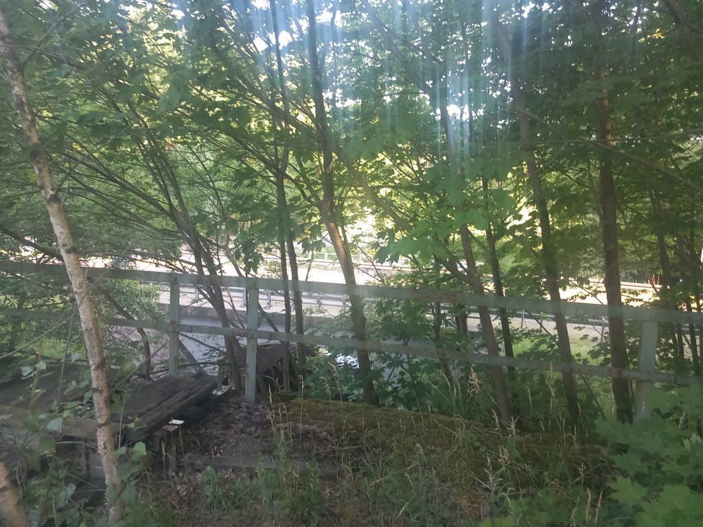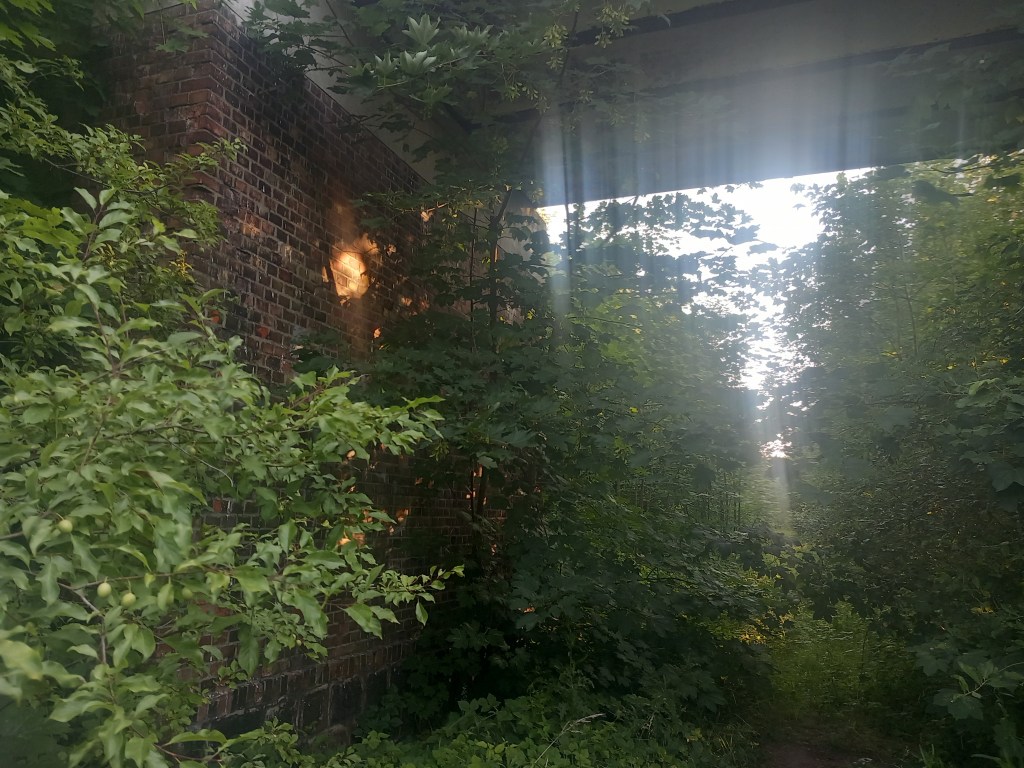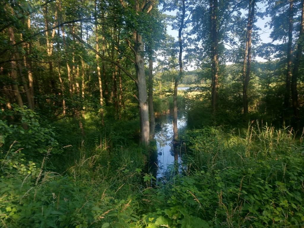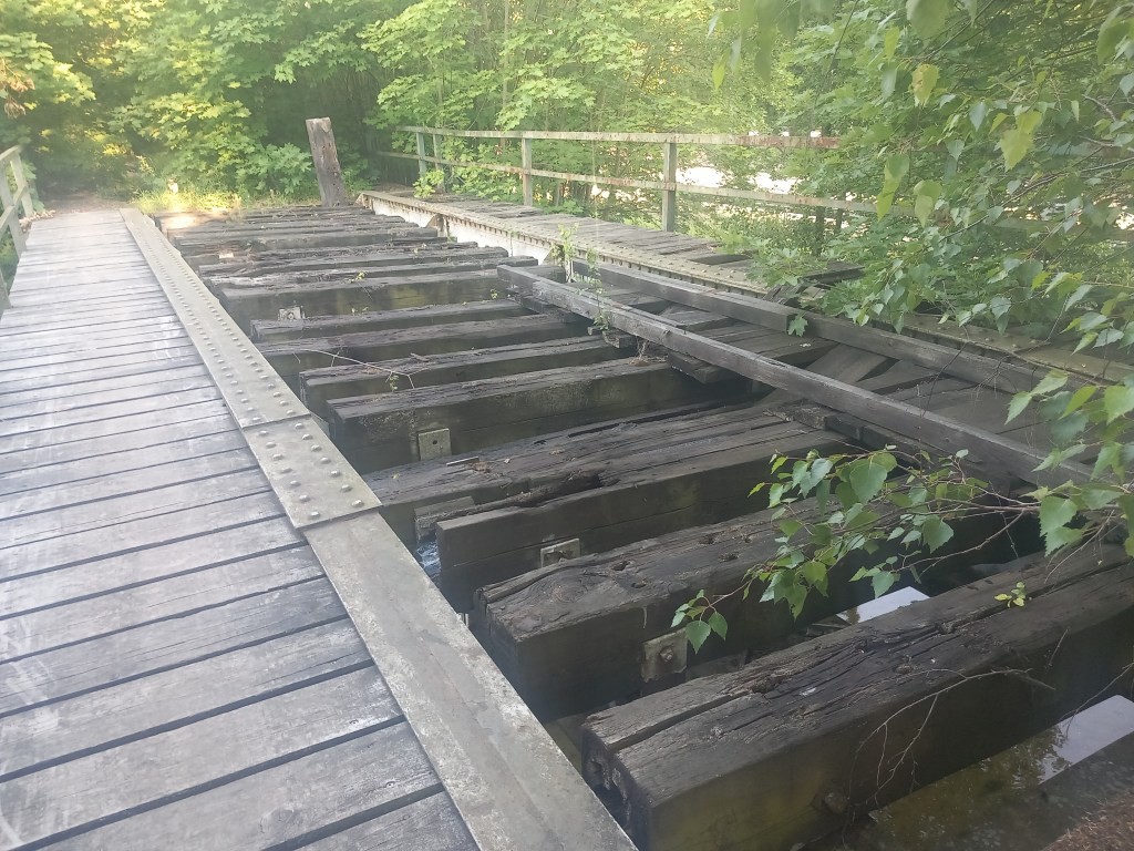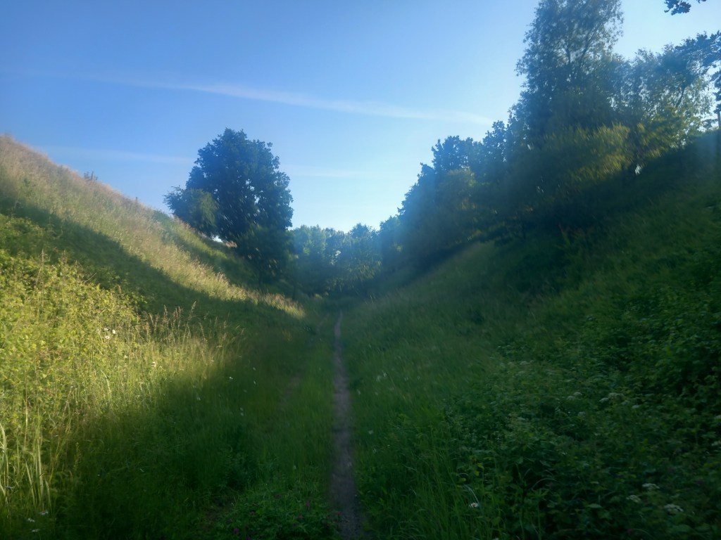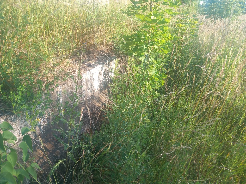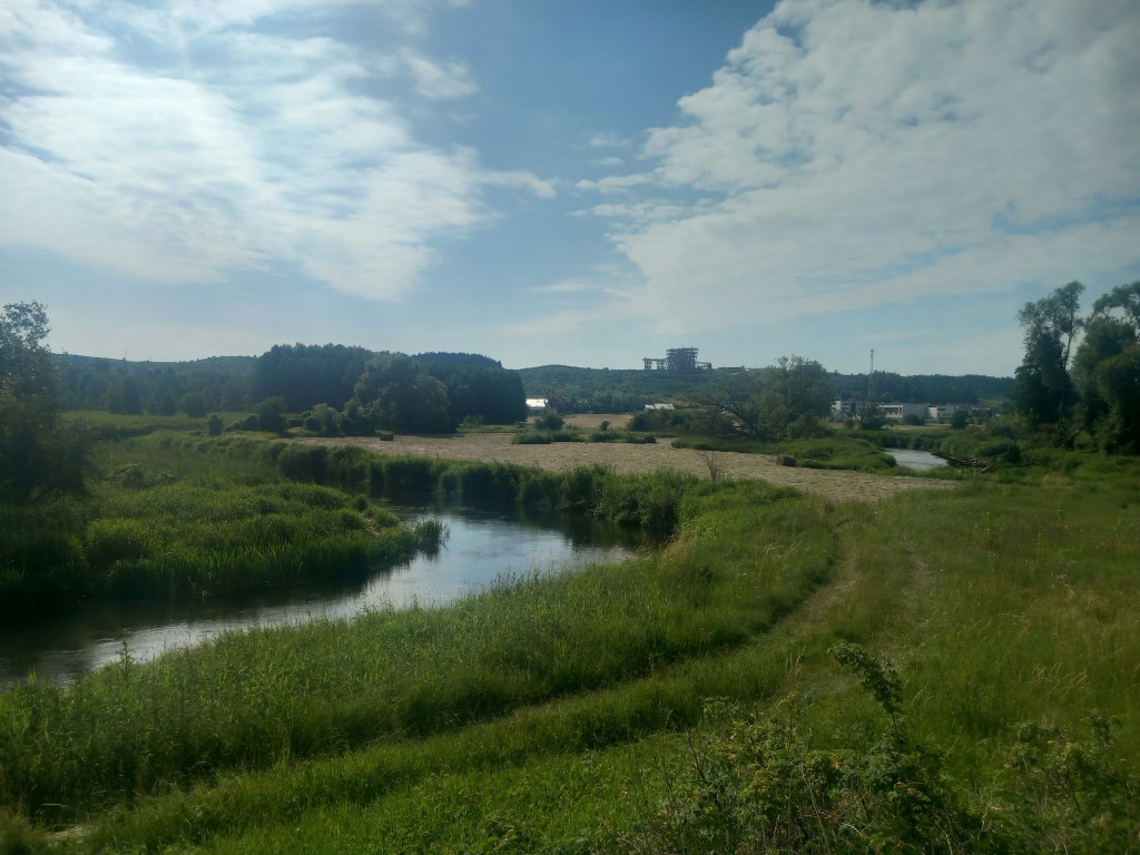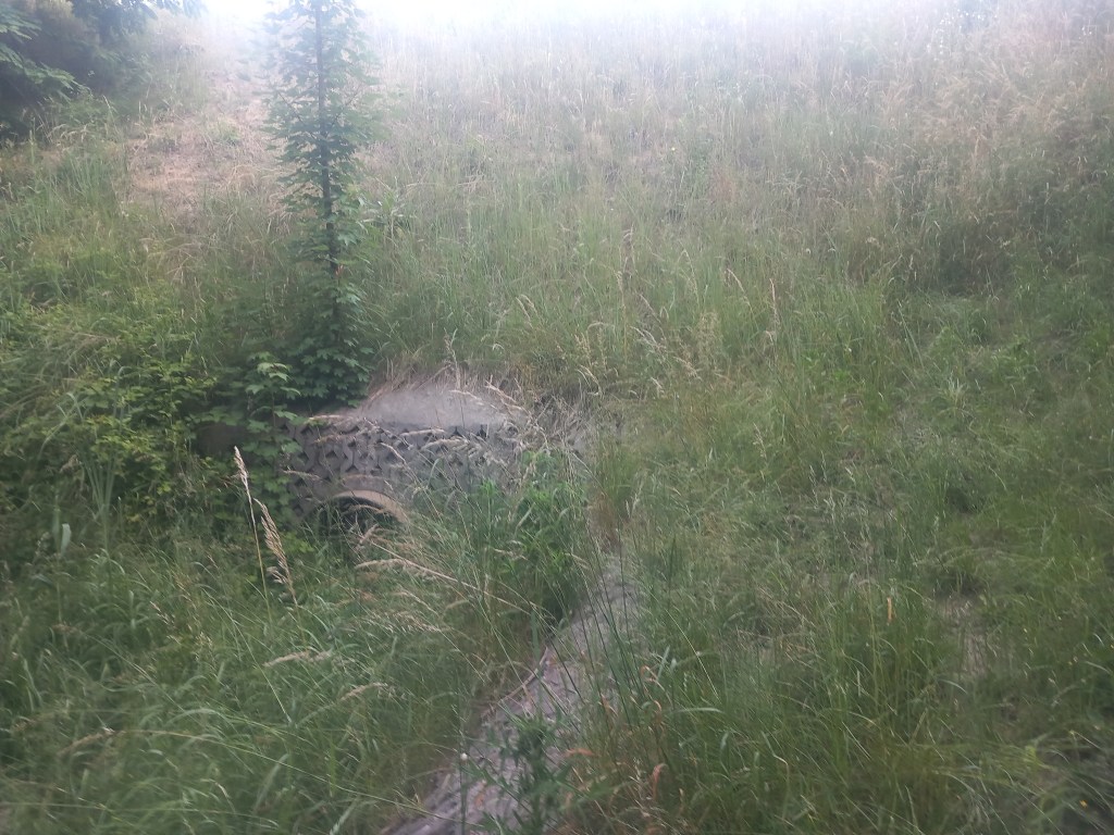 Zatem spod zarośniętego budynku stacji Tama Brodzka idziemy prosto krajową pietnastką, mijamy dwie knajpy, a po około pół kilometra skręcamy w prawo, wraz z zielonym szlakiem prowadzącym do Górzna (https://maronwedruje.com/2023/07/15/szlak-zielony-gorzno-brodnica/). Jednak szlak idzie dalej w miarę szeroką drogą do kolejnego mostu na Drwęcy, a my wybieramy wąską ścieżkę w lewo. Zejście znajduje się mniej więcej na wysokości drogowskazu „Nowy Dwór 1”. Szerokość drogi na tym odcinku nie zachęca do marszu, ale trudno, trzeba się poświęcić 😀 Po chwili przechodzimy przez pozostałości mostu na Skarlance, jest to ostatnia przeprawa na tej rzece, która za jakieś dwieście metrów wpada do Drwęcy. Na moście po lewej stroni widoczne są jeszcze stare drewniane podkłady, my jednak idziemy „po prawicy” (nie mylić z Maryją, która „zasiada po prawicy ojca”). Za mostem droga prowadzi najpierw nasypem, który po jakimś czasie zmienia się w wąwóz. W tym miejscu idziemy lasem. Również zaraz za mostem po prawej stronie rozciąga się bardzo ładny widok na Bagienną Dolinę Drwęcy. Po drodze szukamy pozostałości torów, ciężko dzisiaj cokolwiek znaleźć, ja jedynie na tym etapie napotkałem dwa dawne słupki hektometryczne i oczywiście pozostałości po słupach z linią telegraficzną. Po chwili starotorze skręca w prawo, mijamy pozostałości wiaduktu, później droga staje się chwilowo szersza, prawie dwupasmówka. Po kolejnym zakręcie, tym razem w lewo wychodzimy z lasu i dookoła mamy pola uprawne. Maszerujemy teraz w kierunku północnym, podobnie jak prawie podczas całej wyprawy. Idąc jeszcze około kilometra mamy kolejny wiadukt, tym razem w całości. Górą przebiega droga do Kantyły. Później mamy kolejny zakręt w lewo i docieramy do pierwszego miejsca, gdzie trzeba opuścić starotorze, bo niestety dawny wiadukt pod drogą krajową nr 15 został zasypany, obecnie prowadzi tam jedynie przepust wodny.