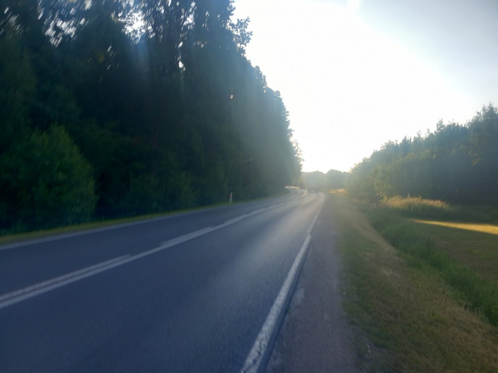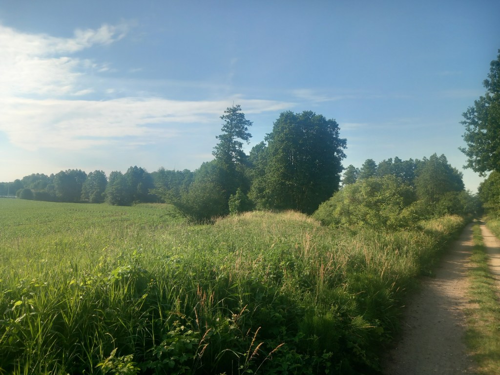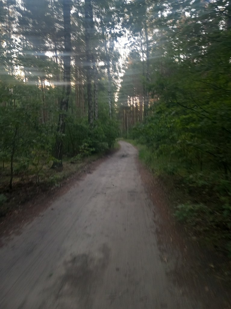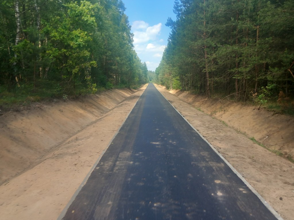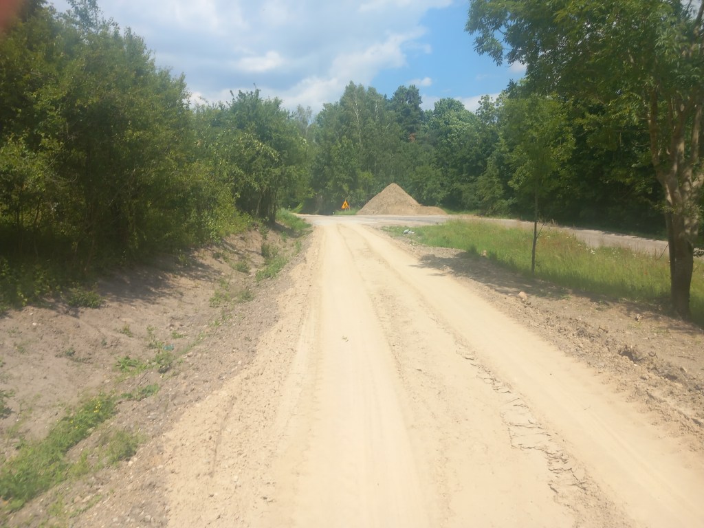 Za Radomnem starotorze skręca delikatnie w lewo, to jest w kierunku zachodnim. Docieramy do dzisiejszego (15 czerwca 2024 roku) zakończenia ścieżki rowerowej. Znajduje się on na skrzyżowaniu z żółtym szlakiem, którym kiedyś szliśmy z Iławy do Ostrowitego (https://maronwedruje.com/2023/07/17/szlak-zolty-czesc-1-ilawa-ostrowite-kolo-jablonowa/). Pamiętam, że podczas tamtej wycieczki, a było to w lipcu 2022 roku końcówka ścieżki była wyraźna, jednak dziś widać postęp, bo trasa jest w budowie. Normalni ludzie w tym miejscu zeszli by z trasy i poszli tym szlakiem w stronę Iławy, jednak kto powiedział, że ja się do takowych zaliczam? Oczywiście poszedłem dalej prosto, pierwszy odcinek „budowy” przebiega po utwardzonym piasku, następnie mamy świeży asfalt, jeszcze bez namalowanych znaków. Po drodze mamy skrzyżowanie z drogą z Jamielnika do Radomna.