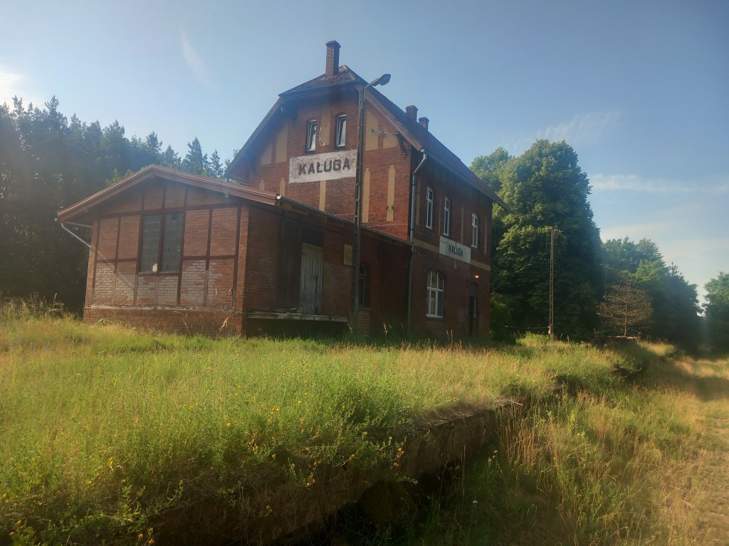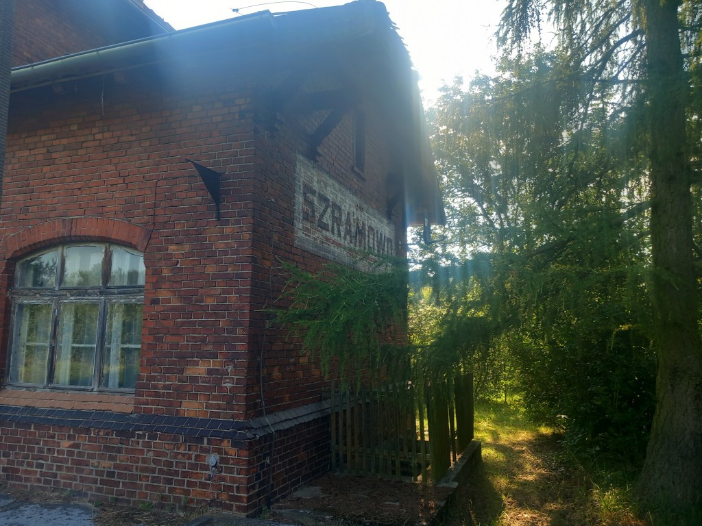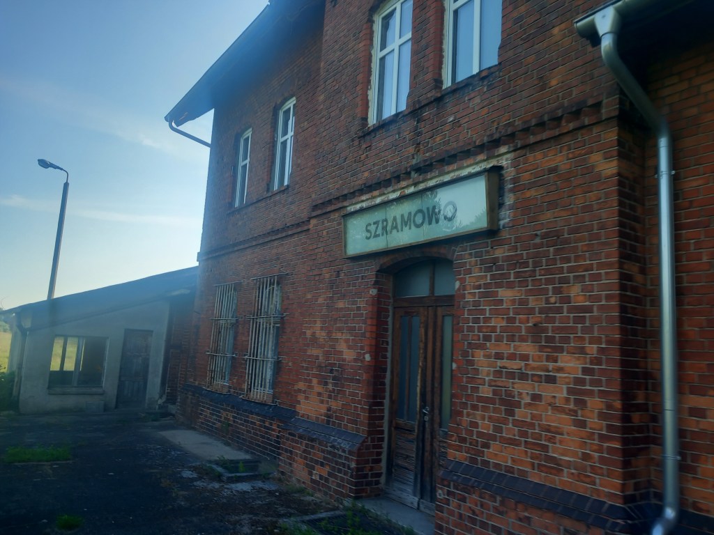 Po kilku kolejnych zakrętach w lewo i w prawo, kilku przejazdach przez polne/leśne drogi, między innymi przez muszelkę, wreszcie po lewej stronie ukazuje nam się za drzewami jezioro Szramowskie, a po prawej pierwsze zabudowania tej wsi. Za kolejne kilkaset metrów docieramy do dawnej stacji. Jednak jeszcze przed nią widzimy po prawej stronie dawny nasyp, prawdopodobnie była tam kiedyś jakaś bocznica (później wyczytałem w czeluściach Internetów, że prowadziła ona do zakładów Prebut). Docieramy do ceglanego budynku stacji, w którym znajdują się pozostałości dawnej nastawni, Widzimy również, że równia stacyjna jest dosyć szeroka, czyli kiedyś musiało być tam kilka torów. W odległości około 500 metrów za stacją znajduje się kolejny charakterystyczny dom z czerwonej cegły, było to oczywiście kiedyś miejsce zamieszkania lokalnych kolejarzy. Później mamy następny przejazd drogowy, na którym widoczne są nawet stare podkłady betonowe! Za Szramowem już nie wiem który raz wchodzimy do lasu (natrafiłem nawet na kilka jadalnych grzybków) Cały czas równolegle prowadzi muszelka. Zbliżamy się do granicy województwa kujawsko-pomorskiego i warmińsko-mazurskiego. Jednak wcześniej docieramy do pięknie położonej w lesie stacyjki, to jest do Kaługi. Właściwy budynek poprzedza mała czerwona chatka, prawdopodobnie był to szalet stacyjny. W tym miejscu peron jest dosyć wyraźny i nawet długi (w porównaniu na przykład z Jajkowem).