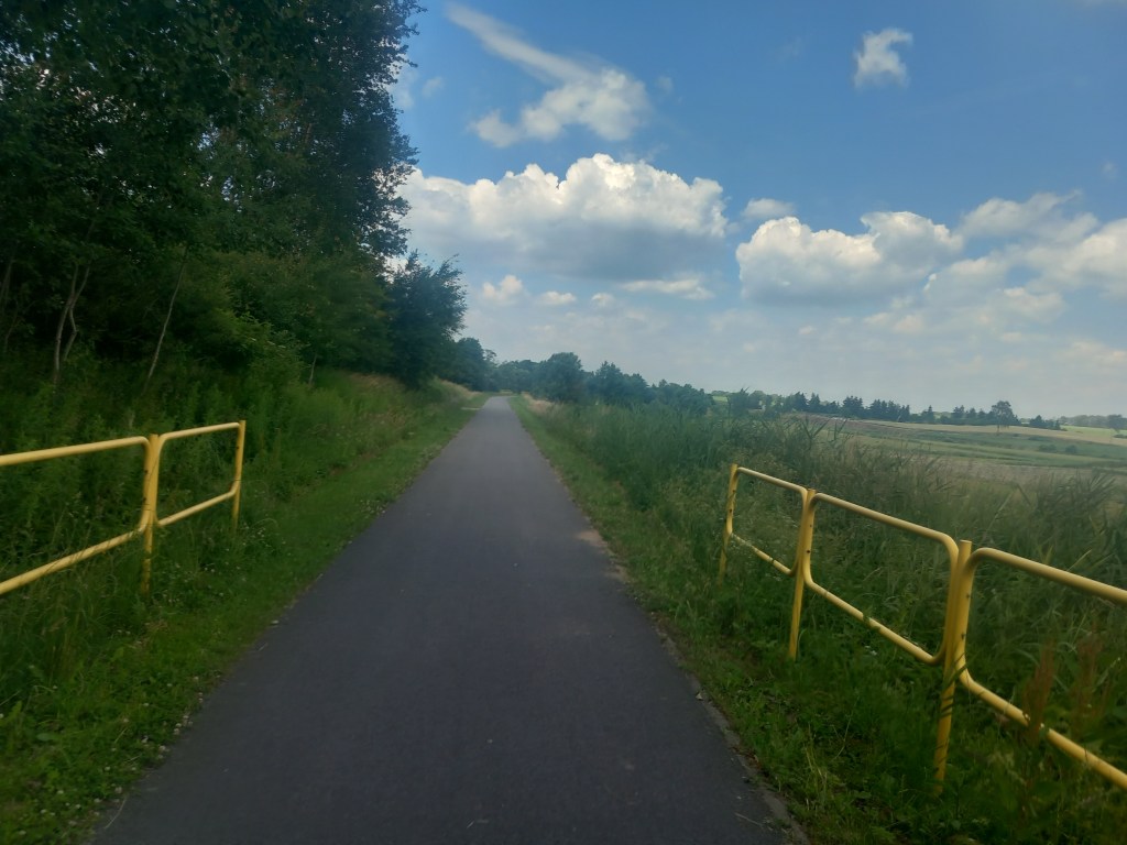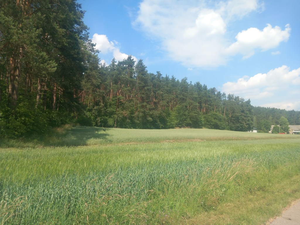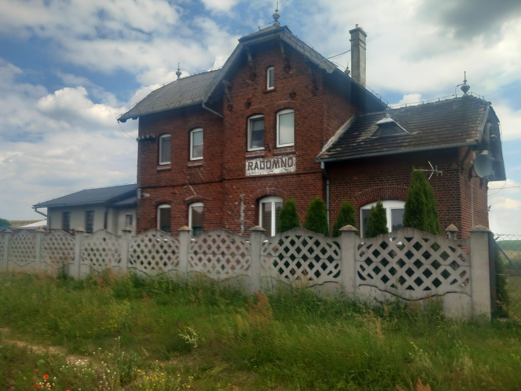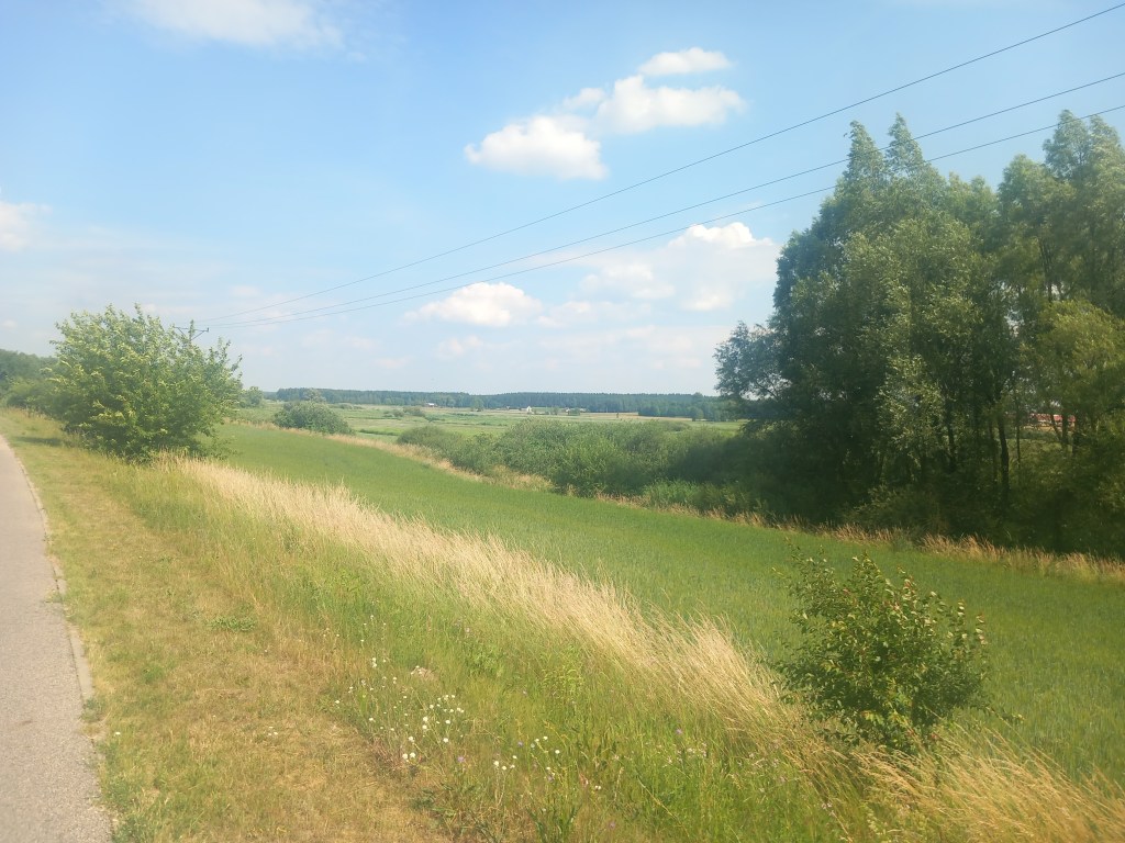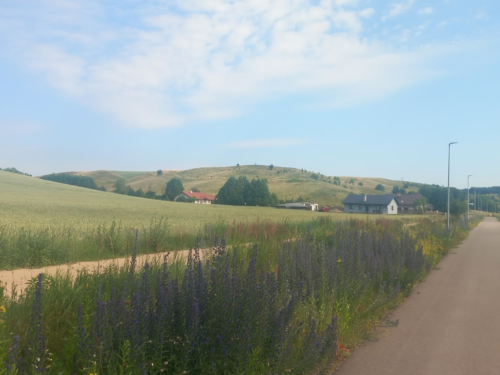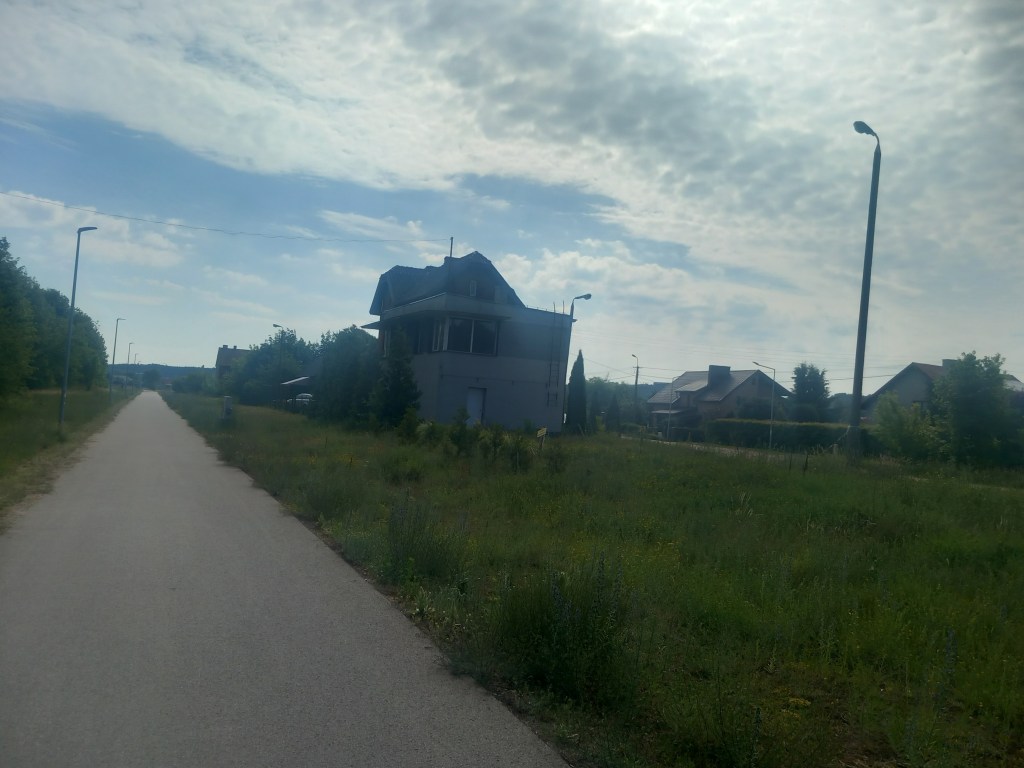 Za tą wsią przeplatają się pola i lasy wraz z pagórkami i po kolejnych czterech kilometrach docieramy do ostatniego przystanku na dawnej linii, to jest do Radomna. Jednak wcześniej mamy kolejne miejsce parkingowe, prawdopodobnie powstało w czasach, kiedy ścieżka rowerowa się tam kończyła. Obecnie prowadzi ona znacznie dalej i jest cały czas na bieżąco dobudowywana.