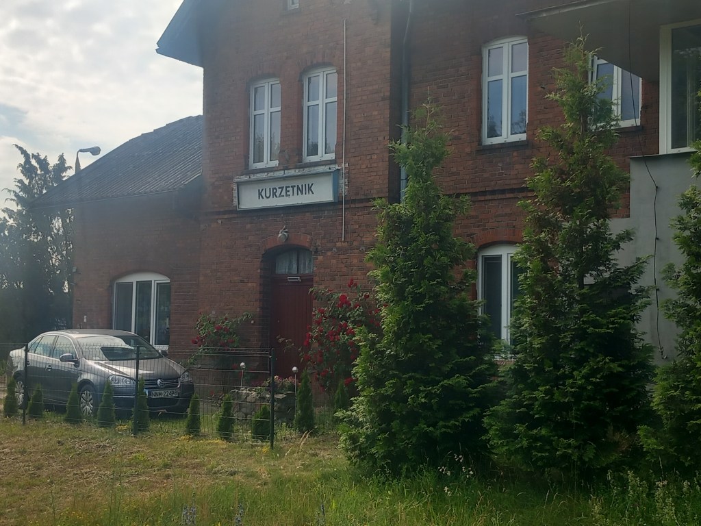 Niedługo docieramy do jedynej na tej trasie stacji leżącej na osi wschód-zachód (czy jak kto woli równoleżnikowo, a nie południkowo) to jest do Kurzętnika. Po lewej stronie stoją zakłady Prefabet produkujące prefabrykaty betonowe, a po prawej silosy zakładu Do-Rol. Przed budynkiem stacji (tak, zgadliście, również z czerwonej cegły) stoi dawna nastawnia. Za dworcem mamy kolejny budynek kolejowy i przejazd, a dalej po lewej stronie sklep spożywczy wraz ze stadionem piłkarskim drużyny KS Zamek.
