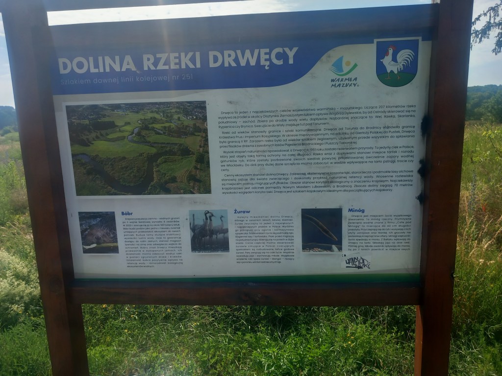 Kolejny odcinek naszej wycieczki, a zarazem ścieżki rowerowej, prowadzi niestety ulicą z dosyć sporym ruchem. Na szczęście mamy wytyczony pas zarówno dla rowerów jak i dla pieszych. Wynagrodzeniem za hałas silników są również widoki po prawej stronie, a konkretnie meandry Drwęcy (w tym miejscu jest ona znacznie węższa niż w Brodnicy). Przez krótką chwilę również zbaczamy z dawnego przebiegu toru (ja bym przeoczyłem ten fakt, tylko że ujrzałem w pewnej odległości dawną tarczę ostrzegawczą odnoszącą się do semafora wjazdowego od strony Brodnicy). Fakt ten oznacza, że zbliżamy się do stacji w Nowym Mieście Lubawskim, która również była kiedyś węzłową. Mianowicie prowadziła tam trasa do Zajączkowa Lubawskiego (tego na linii nr 9 między Iławą, a Działdowem) między innymi przez Pacołtowo i Gwiździny. Znajdował się tam również przystanek Nowe Miasto Lubawskie Południe (niektóre źródła podają nazwę Południowe). Jednak trasa ta, została zaorana jeszcze wcześniej niż 251, czyli w 1993 roku. Pozostałości nasypu widzimy podczas naszej wycieczki wraz z dawnym wiaduktem.