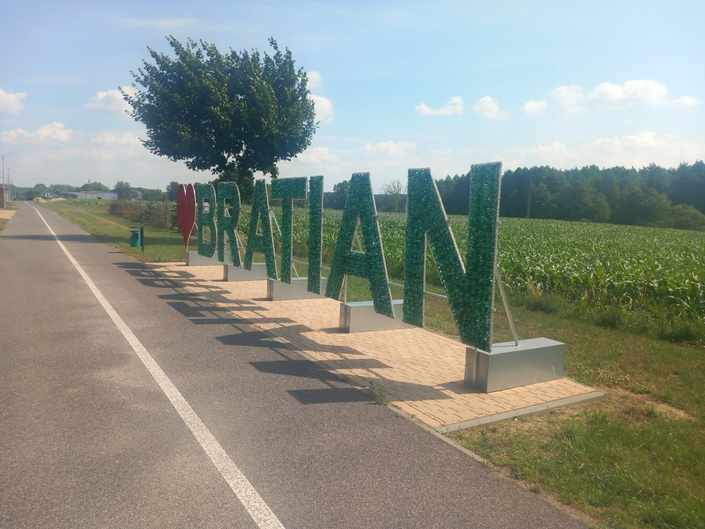 Kolejnym punktem orientacyjnym jest druga nastawnia, tym razem opuszczona. Dalej stoją również dwa semafory, jeden kształtowy, drugi świetlny. Zostały one prawdopodobnie zachowane żeby przypominać o dawnym przeznaczeniu ścieżki rowerowej i tym co się kiedyś znajdowało na jej miejscu. Wychodzimy z Nowego Miasta, dalej trasa jest podzielona na pół biała linią, jedna część dla pieszych, a druga dla rowerzystów. Wchodzimy do Łąk Bratiańskich, a dalej do właściwego Bratiana, gdzie mamy kolejną na trasie stację z czerwonej cegły.