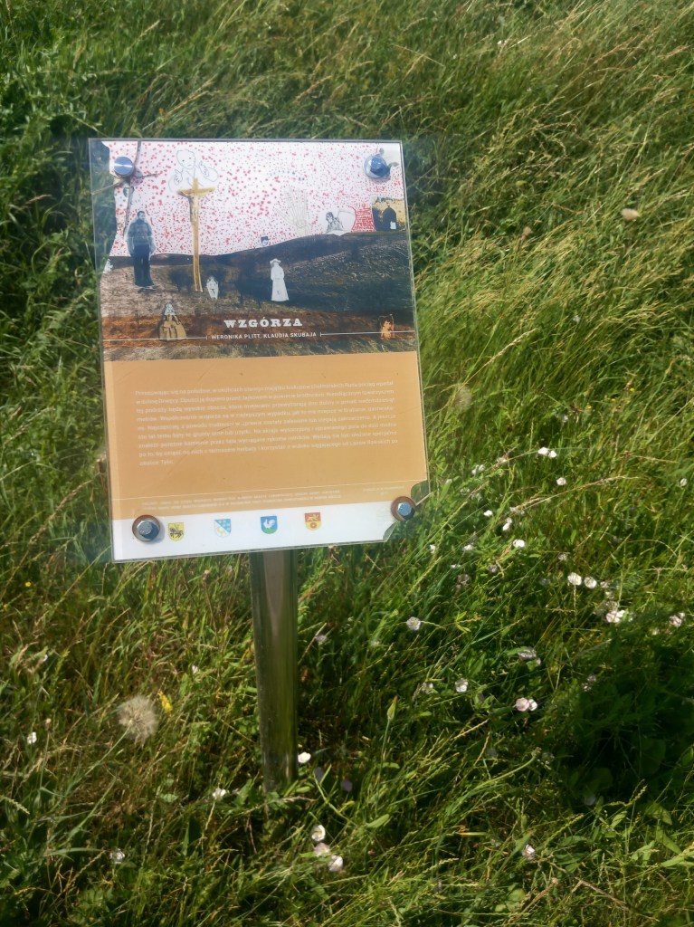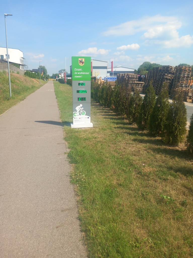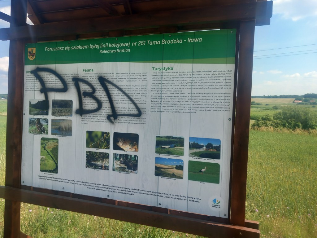 Za stacją mamy przejazd z asfaltową drogą, którą kiedyś już szliśmy (https://maronwedruje.com/2023/07/24/wokol-komina-2-do-brzozia/) i wspomnianą wcześniej granicę województwa. Widać to wyraźnie, gdyż zaraz za drogą zaczyna się elegancka droga rowerowa, która towarzyszy nam praktycznie do końca trasy (szczegóły wkrótce). W tym miejscu znajduje się również miejsce postojowe z ławeczkami, stolikami oraz placem zabaw. Stoją również tablice informacyjne, na całej trasie będzie ich jeszcze kilkanaście. Stanowią one ciekawe urozmaicenie trasy. Można między innymi dowiedzieć się z nich, że naszą linię otwarto w 1902 roku, zatem ruch na niej nie przetrwał nawet 100 lat (zamknięto go 3 kwietnia 2000 roku). Inną formą zagospodarowania turystycznego są występujące co około pół kilometra ławeczki wraz ze stojakami na rowery.