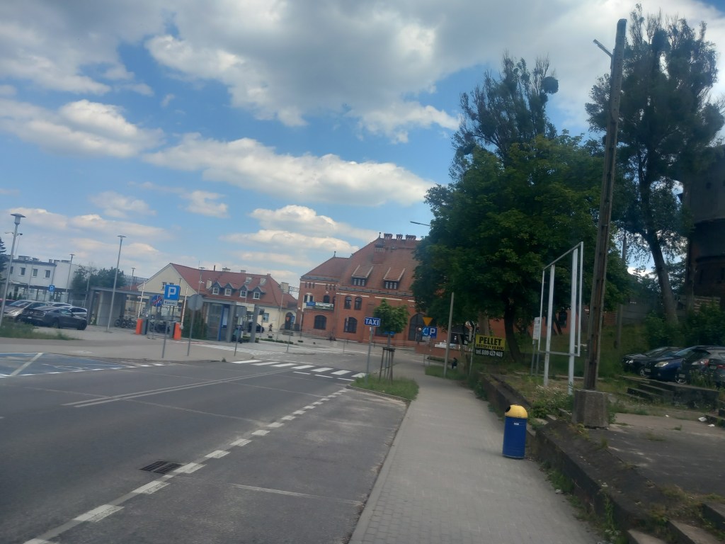Zbliżamy się do centrum miasta, za wiaduktem nad ulicą 3 Maja znowu wędrujemy dawnym torem. Zaraz za wiaduktem prowadzi pod górkę ulica Zatorze i docieramy do dawnej nastawni (obecnie znajduje się w niej zakład kosmetyczny). Następnie po prawej stronie mamy wreszcie budynek stacyjny, jednak różni się wyglądem od innych na tej linii, nie jest z czerwonej cegły. Z drugiej strony budynku znajduje się dworzec PKS, jest to bardzo częsty zabieg w miastach tej wielkości. Z kolei po drugiej stronie jest plac zabaw z siłownią itd.