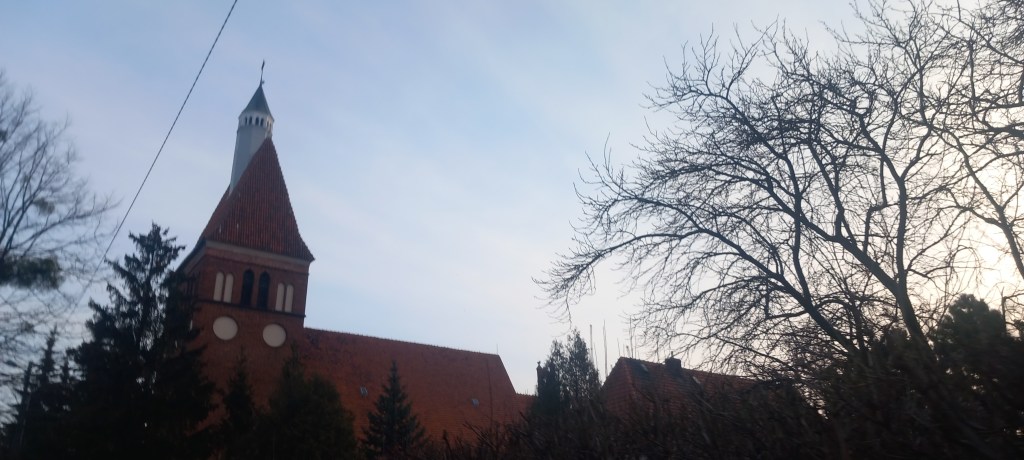 W tej fazie towarzyszy nam jeszcze szlak zielony, którym w zeszłym roku przyszliśmy z Kowalewa (https://maronwedruje.com/2024/05/31/szlak-zielony-3-kowalewo-jablonowo/), jednak po kilkuset metrach (w okolicach sklepu Biedronka po lewej stronie) skręcamy w prawo do kolejnego tunelu pod torami. Nasza czerwień prowadzi trochę dookoła ulicą Główną i następnie Mostową pod wiaduktem, ale my jak zawsze oszukaliśmy system i skróciliśmy sobie trasę. Po wyjściu z tunelu idziemy dalej ulicą Kościelną, po prawej stronie widzimy kolejowe zabudowania należące do byłej sekcji PKP. Idąc dalej mijamy szkołę podstawową i świątynie, od której wzięła się nazwa ulicy. Jest to kościół pod wezwaniem Chrystusa Króla i Matki Bożej Nieustającej Pomocy.