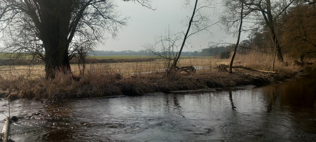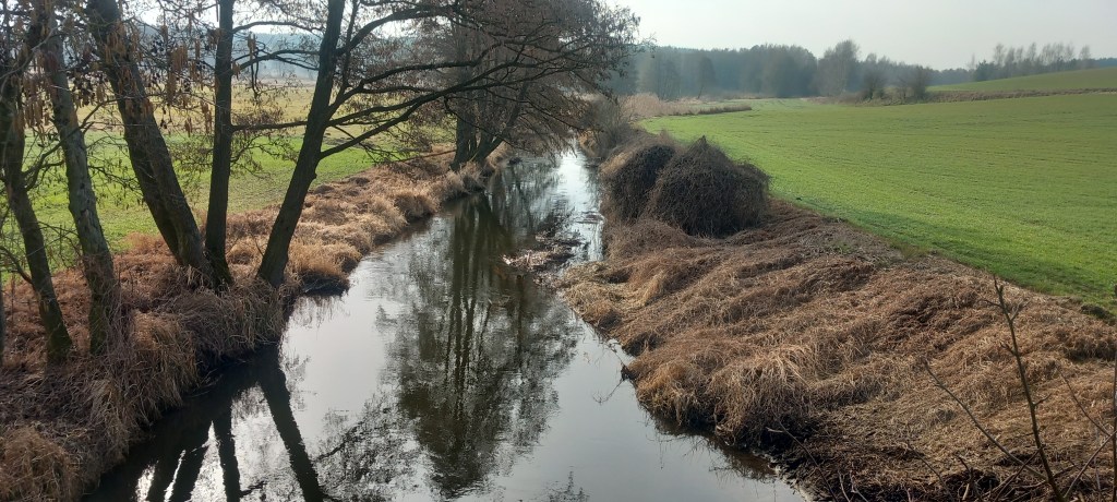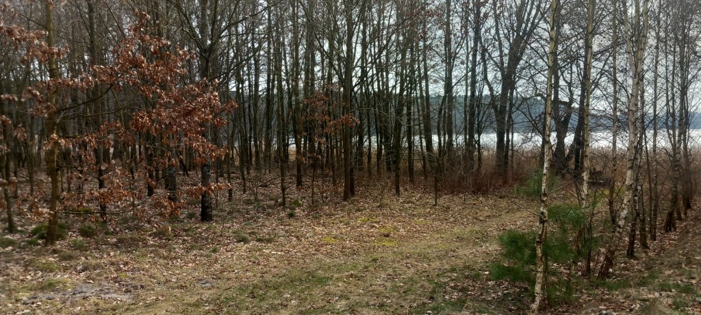 a kolejnym skrzyżowaniu wybieramy drogę w lewo, a następnie na kolejnym w prawo, w kierunku Płowężka (nie mylić ze znajdującym się obok Płowężkiem). Po drodze znowu widzimy na drzewie niewyraźne oznakowania czerwonego szlaku. Po mniej więcej 15 minutach docieramy do skrzyżowania z zielonym, tam już szliśmy kiedyś na jesienny spacerek z Ostrowitego do Grudziądza (https://maronwedruje.com/2023/11/16/ostrowite-grudziadz/). Kolejny krótki odcinek pokrywa się nawet z tamtą trasą, jednak po chwili czerwony idzie prosto, a my skręcamy w prawo w niebieski. Mamy tam drogowskaz do posesji w Lisnowie. Docieramy do lasu, po niedługiej chwili również po prawej stronie znajduje się drogowskaz „Do punktu czerpania wody”. Warto podejść tam i nacieszyć się przez chwilkę szumem odwiecznych fal. Spiętrzyło się tam nawet coś w rodzaju małego jeziorka.