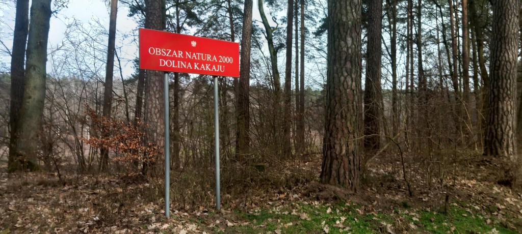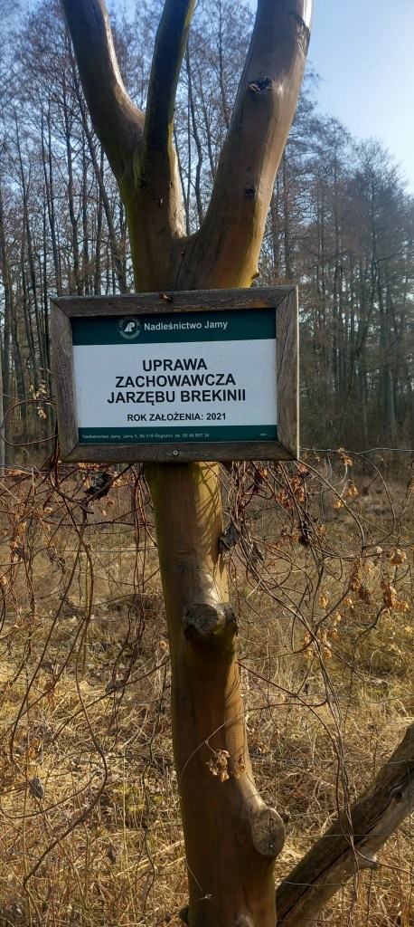 Nie wspomniałem, że jest to rzeka Osa. Będzie nam ona jeszcze towarzyszyć przez ponad połowę wycieczki. Wracamy do szlaku, dalej widzimy ogrodzony teren, na którym wisi tabliczka „Uprawa zachowawcza Jarzębu Brekinii”. Na Wikipedii wyczytamy, że jest to zagrożona roślina objęta ścisłą ochroną gatunkową; oraz że w Polsce przebiega jego wschodnia granica zasięgu.