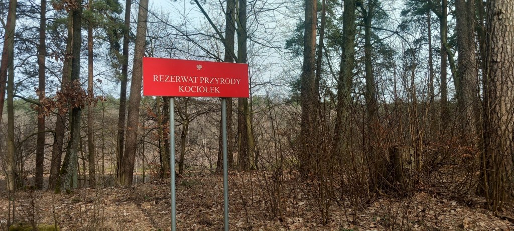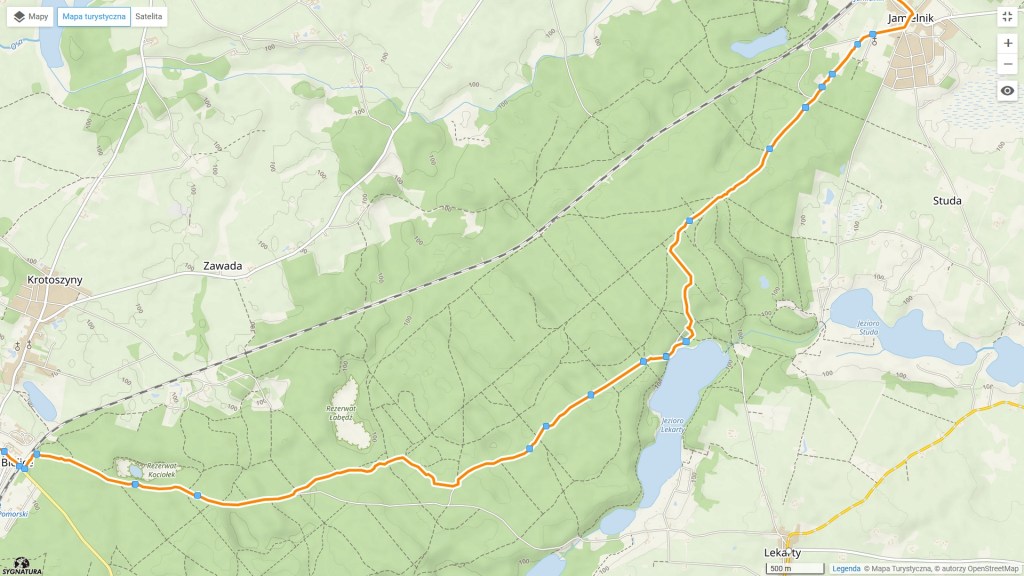 Docieramy do torów kolejowych linii 353, które przecinamy i zaraz za nimi skręcamy w szutrową drogę w lewo. Chwilkę idziemy równolegle, ale po dwustu metrach wchodzimy w las. Bedzie nam on towarzyszył przez dłuższy czas. Po lewej stronie mamy dwa torfowiskowe rezerwaty przyrody: Kociołek i Łabędź. Oba są zarośniętymi jeziorami. Przy okazji krzyżujemy się też z trasą wycieczki z Konojad do Jamielnika (https://maronwedruje.com/2023/07/28/wokol-komina-4-do-jamielnika/). O Jamielniku jeszcze dzisiaj będzie.