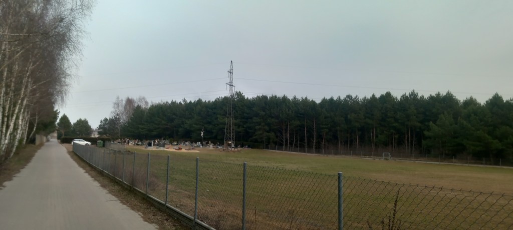 Ogólnie przez las możemy iść kilkoma wariantami. Całkowicie nad Jeziorem Lękarty, albo częściowo. Wszystko zależy od czasu i naszych sił. Ja chciałem iść jak najbliżej wody, jednak nie starczyło czasu. Znad jeziora maszerujemy prostą ścieżką, która wkrótce zmienia się w ulicę Podleśną. Docieramy do Jamielnika. Z prawej strony mijamy cmentarz, a dalej kościół pod wezwaniem Świętej Faustyny Kowalskiej. Podleśną docieramy do Kościelnej, dalej jest Szkolna, skrzyżowanie na którym wybieramy drogę w lewo (jest to ulica Nowomiejska). Przechodzimy wiaduktem pod torami linii 353 (a jakże) i ulicą Lipową docieramy do zakrętu w lewo, gdzie idziemy prosto szutrową ścieżką do najbliższego skrzyżowania. Tam znowu zaczyna się nasz ulubiony asfalt. Po jakimś czasie docieramy do wsi o wdzięcznej nazwie Szepierzyzna; kolejną miejscowością jest Karaś. Pierwszą tamtejszą atrakcją jest dawny ewangelicki cmentarz. Niestety, w przeciwieństwie do niektórych lepiej zachowanych tego typu atrakcji, tu mamy jedynie tablicę pamiątkową.