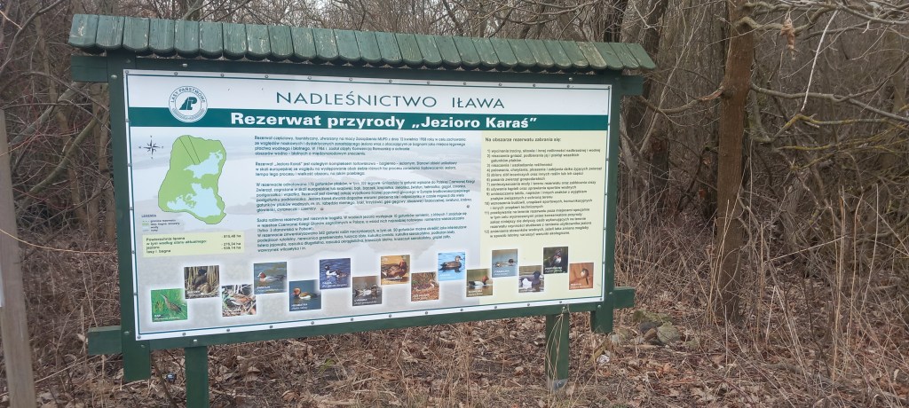 Mniej więcej 300 metrów za nekropolią, również po lewej stronie widzimy drogowskazy prowadzące do Jeziora Karaś. Jest to rezerwat przyrody, ustanowiony dla ochrony zarastającej linii brzegowej, a tym samym siedliska wielu gatunków ptaków wodno-błotnych. Znajduje się tam też tablica informacyjna wraz z wieżą widokową. Bezpośrednio przed nimi jest duże miejsce parkingowe, jak i sporo ławeczek z grillem do zorganizowania tak zwanej posiadówy.